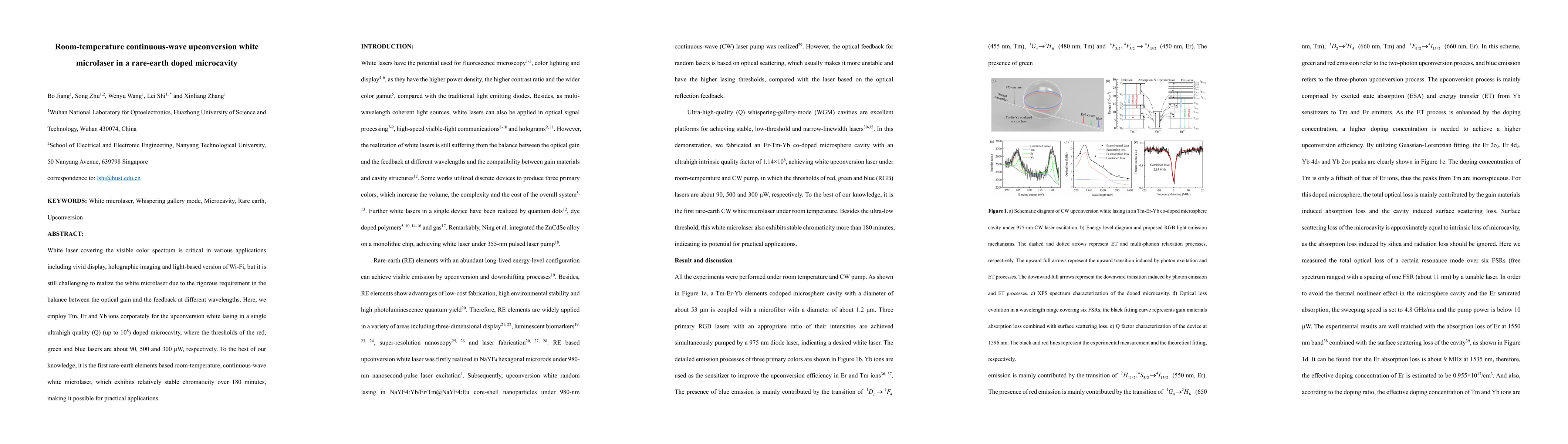 This paper reports a room-temperature continuous-wave upconversion white microlaser using Tm, Er, and Yb ions in a high-quality microcavity, achieving stable white lasing over 180 minutes. The microlaser addresses the challenge of balancing optical gain and feedback across different wavelengths, paving the way for applications in vivid display and holographic imaging.