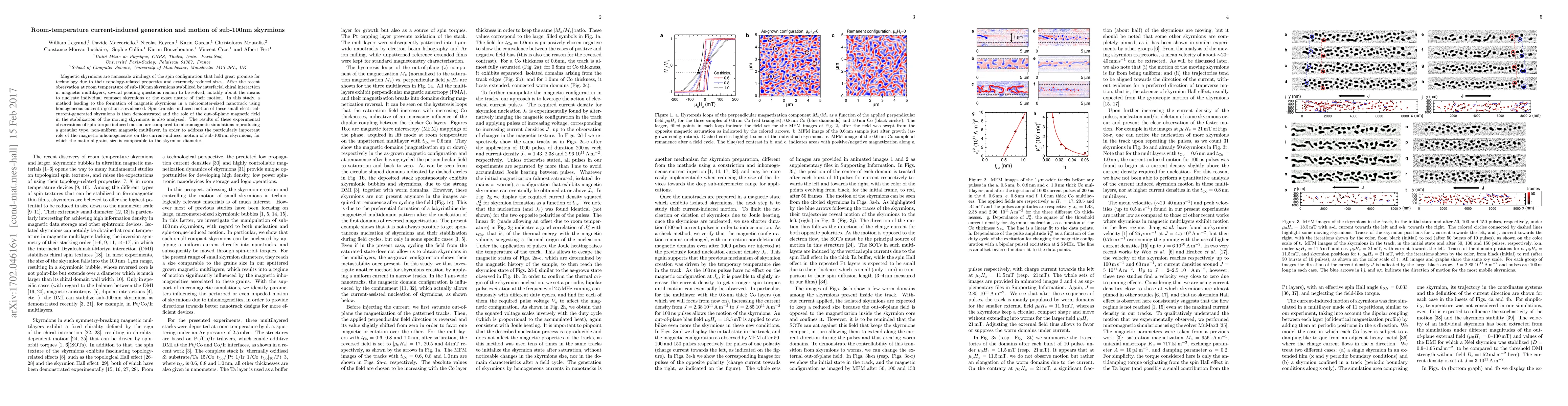 This study demonstrates a method for generating and moving nanoscale magnetic skyrmions using room-temperature current injection, and investigates the role of out-of-plane magnetic fields and material inhomogeneities in stabilizing and guiding their motion, supported by micromagnetic simulations.