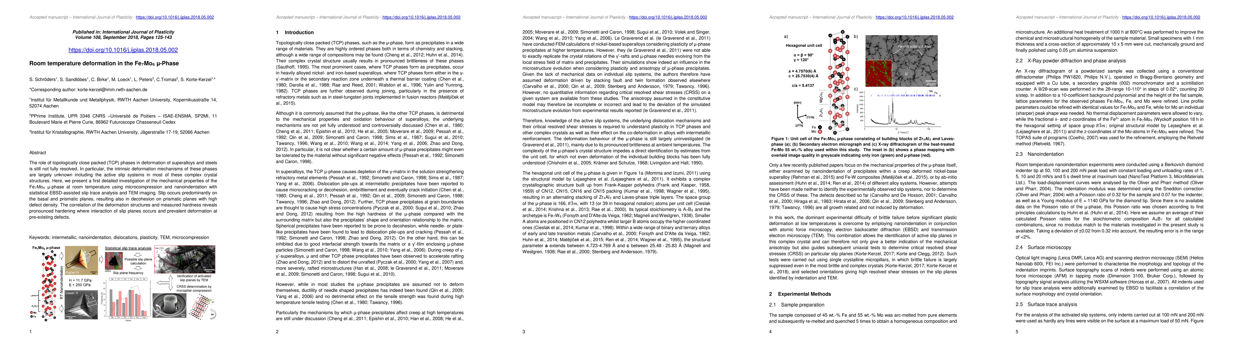 The role of TCP phases in deformation of superalloys and steels is still not fully resolved. In particular, the intrinsic deformation mechanisms of these phases are largely unknown including the active slip systems in most of these complex crystal structures. Here, we present a first detailed investigation of the mechanical properties of the Fe7Mo6 {\mu}-phase at room temperature using microcompression and nanoindentation with statistical EBSD-assisted slip trace analysis and TEM imaging. Slip occurs predominantly on the basal and prismatic planes, resulting also in decohesion on prismatic planes with high defect density. The correlation of the deformation structures and measured hardness reveals pronounced hardening where interaction of slip planes occurs and prevalent deformation at pre-existing defects.