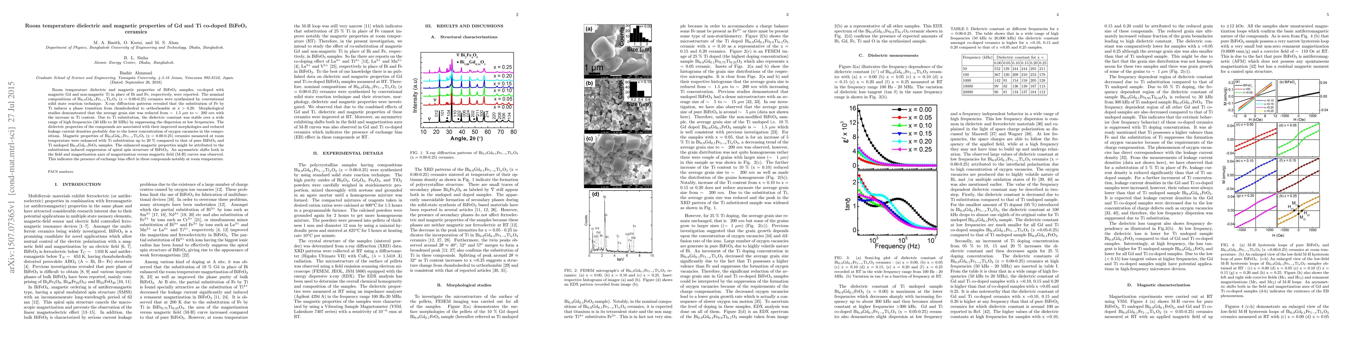This study investigates the dielectric and magnetic properties of BiFeO$_3$ ceramics co-doped with Gd and Ti. The doping alters the phase transition and grain size, stabilizes dielectric constant over high frequencies, and enhances magnetic properties up to 20% Ti substitution, likely due to the suppression of spiral spin structure and the presence of an exchange bias effect.