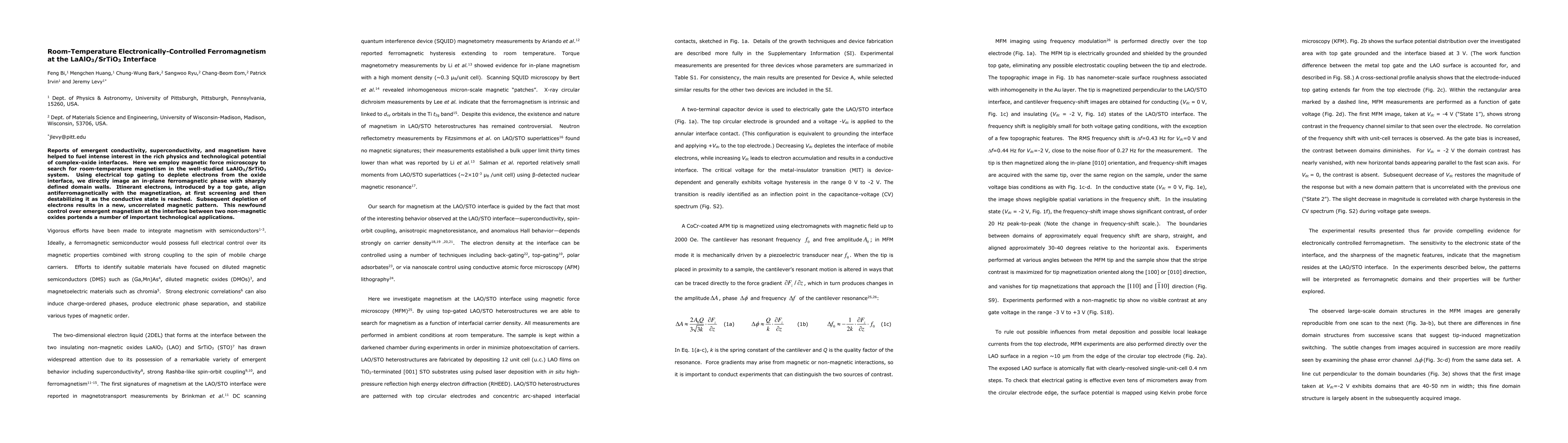 This study reveals room-temperature ferromagnetism at the LaAlO3/SrTiO3 interface, controlled electronically via top gating. The research shows that electron depletion induces a new, uncorrelated magnetic pattern, highlighting potential for advanced technological applications in magnetic control.