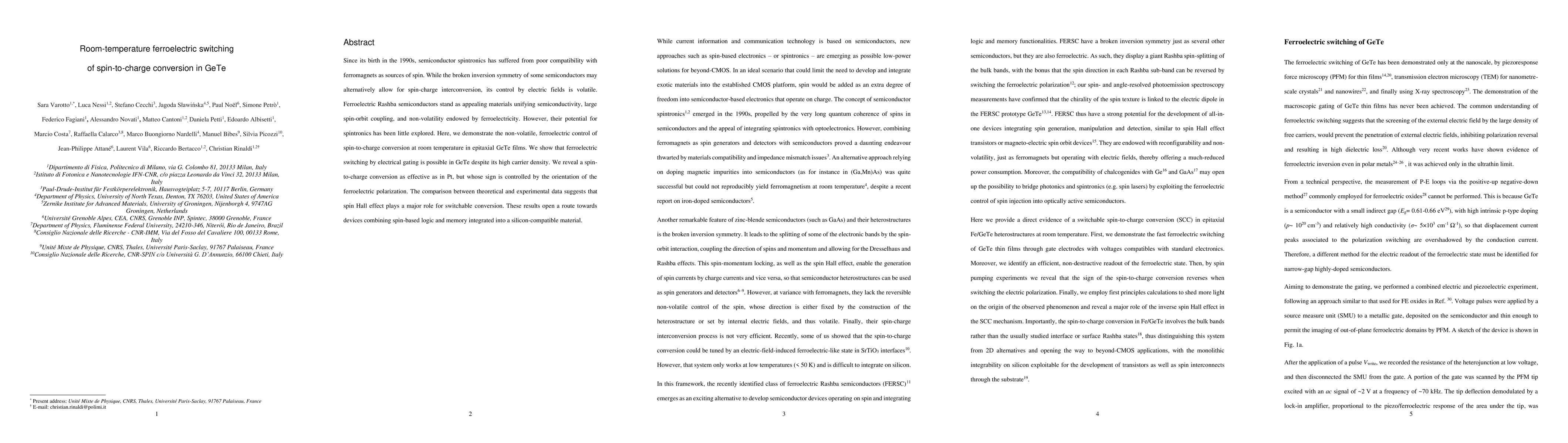 This paper demonstrates room-temperature ferroelectric control of spin-to-charge conversion in epitaxial GeTe films, revealing a non-volatile switchable conversion comparable to Pt and suggesting the spin Hall effect's role. These findings propose a path for integrating spin-based logic and memory in silicon-compatible materials.