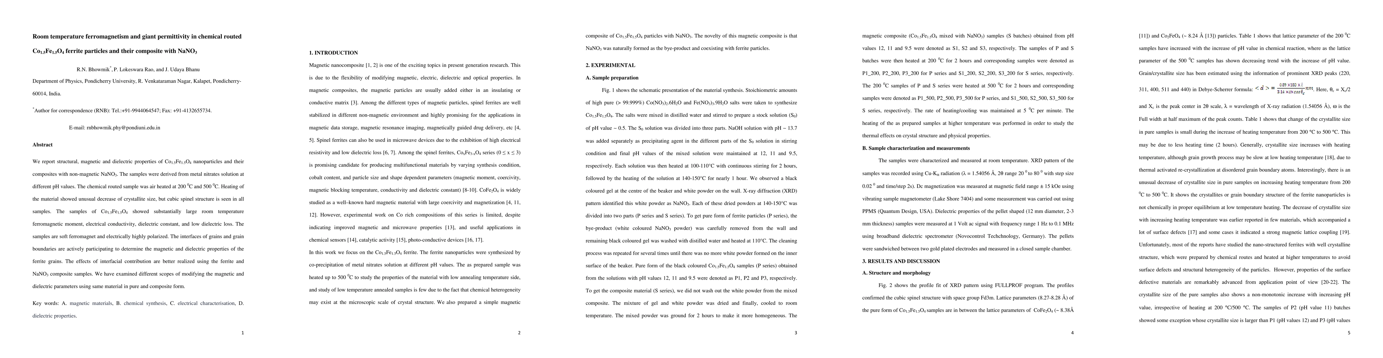 We report structural, magnetic and dielectric properties of Co1.5Fe1.5O4 nanoparticles and their composites with non-magnetic NaNO3. The samples were derived from metal nitrates solution at different pH values. The chemical routed sample was air heated at 200 0C and 500 0C. Heating of the material showed unusual decrease of crystallite size, but cubic spinel structure is seen in all samples. The samples of Co1.5Fe1.5O4 showed substantially large room temperature ferromagnetic moment, electrical conductivity, dielectric constant, and low dielectric loss. The samples are soft ferromagnet and electrically highly polarized. The interfaces of grains and grain boundaries are actively participating to determine the magnetic and dielectric properties of the ferrite grains. The effects of interfacial contribution are better realized using the ferrite and NaNO3 composite samples. We have examined different scopes of modifying the magnetic and dielectric parameters using same material in pure and composite form.