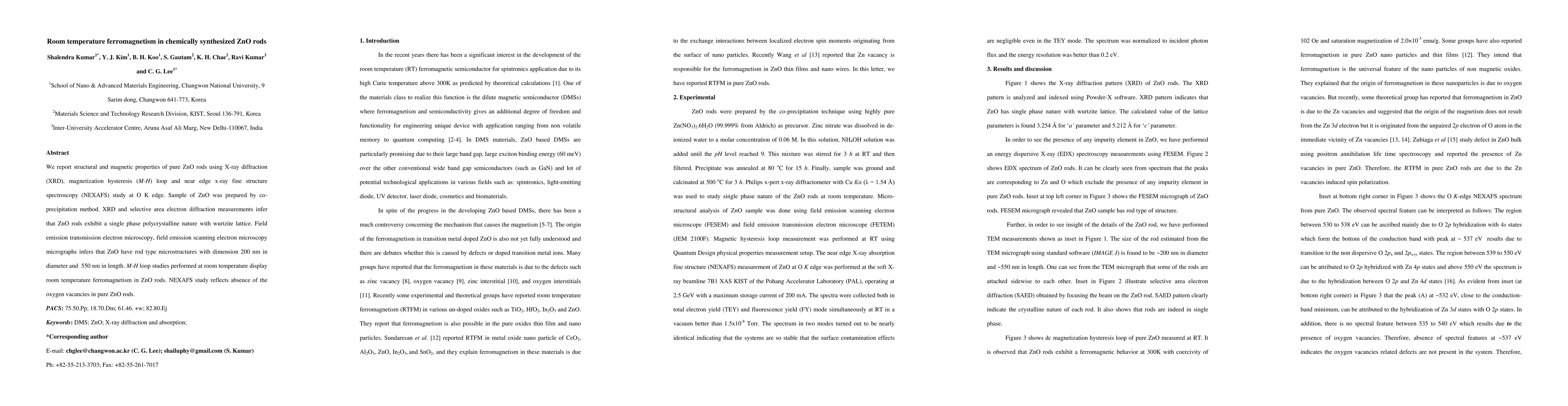 This study investigates the structural and magnetic properties of ZnO rods synthesized via co-precipitation, revealing single-phase polycrystalline wurtzite structure and rod-shaped microstructures. Room temperature ferromagnetism is observed in the M-H loop, despite the absence of oxygen vacancies as confirmed by NEXAFS.