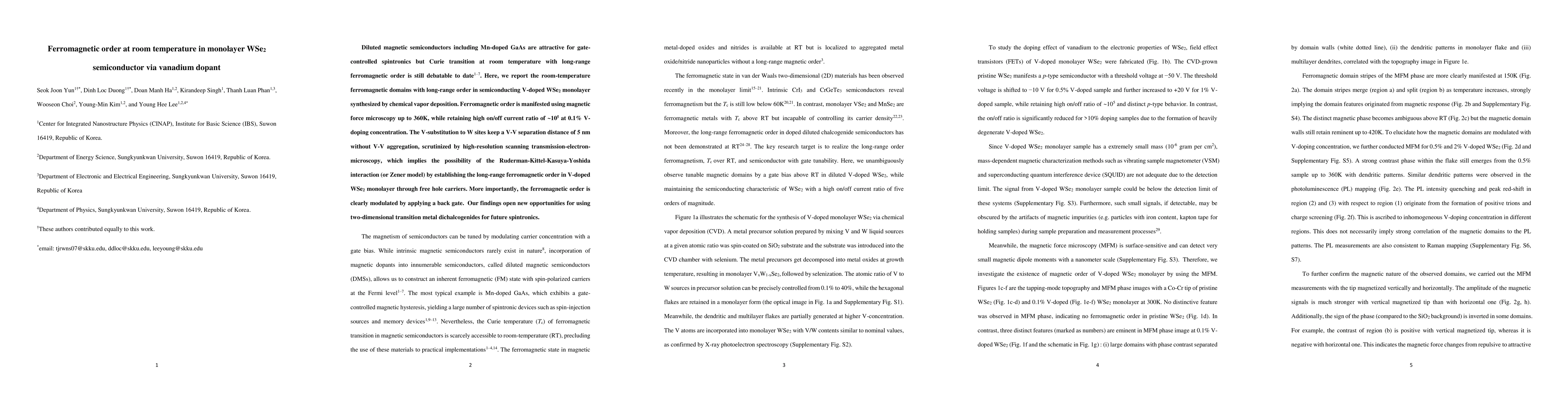 This study reports the successful synthesis of room-temperature ferromagnetism in V-doped WSe2 monolayers via chemical vapor deposition, confirmed by magnetic force microscopy up to 360K. The doping achieves long-range ferromagnetic order without V-V aggregation, suggesting a new route for spintronics using two-dimensional materials.