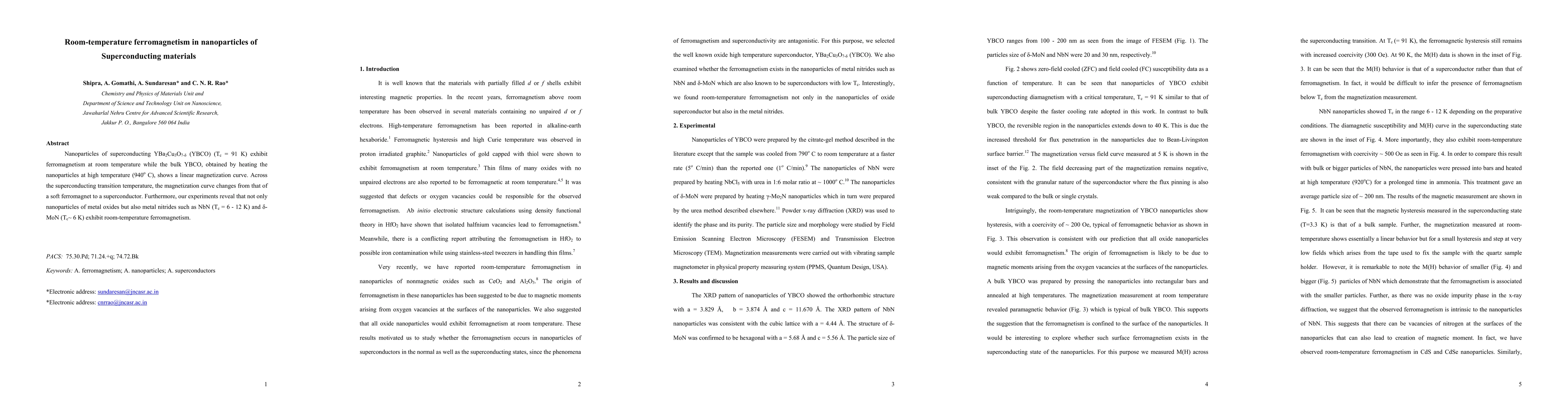 This study reveals that nanoparticles of superconducting materials like YBa2Cu3O7-delta (YBCO) and metal nitrides such as NbN and delta-MoN exhibit ferromagnetism at room temperature, contrasting with the linear magnetization of their bulk counterparts. The transition from ferromagnetic to superconducting behavior occurs across the superconducting transition temperature.