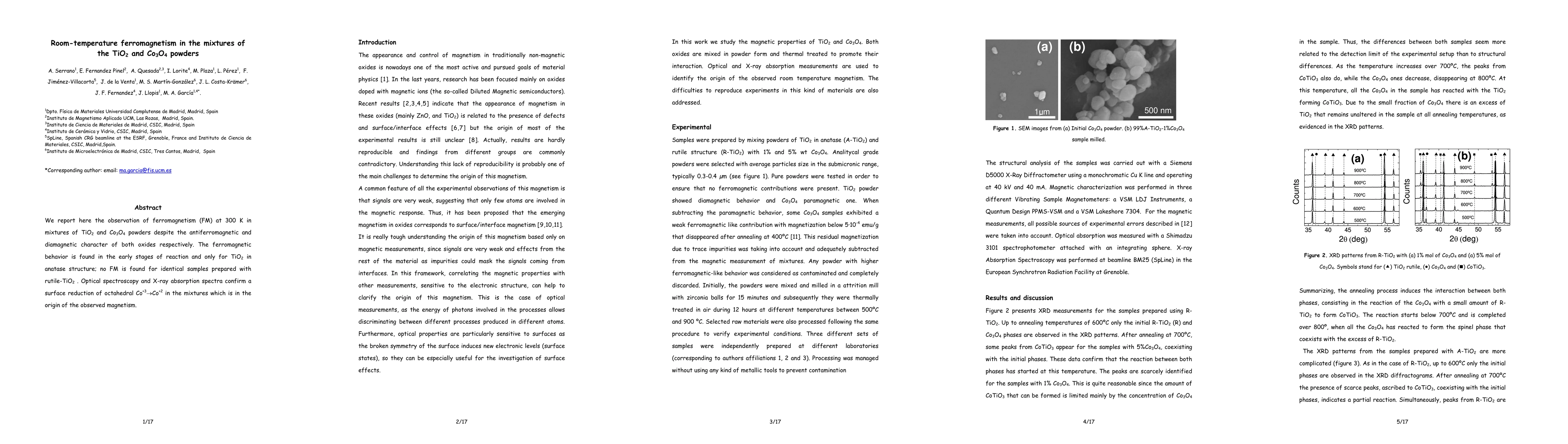 We report here the observation of ferromagnetism (FM) at 300 K in mixtures of TiO2 and Co3O4 powders despite the antiferromagnetic and diamagnetic character of both oxides respectively. The ferromagnetic behavior is found in the early stages of reaction and only for TiO2 in anatase structure; no FM is found for identical samples prepared with rutile-TiO2. Optical spectroscopy and X-ray absorption spectra confirm a surface reduction of octahedral Co+3->Co+2 in the mixtures which is in the origin of the observed magnetism