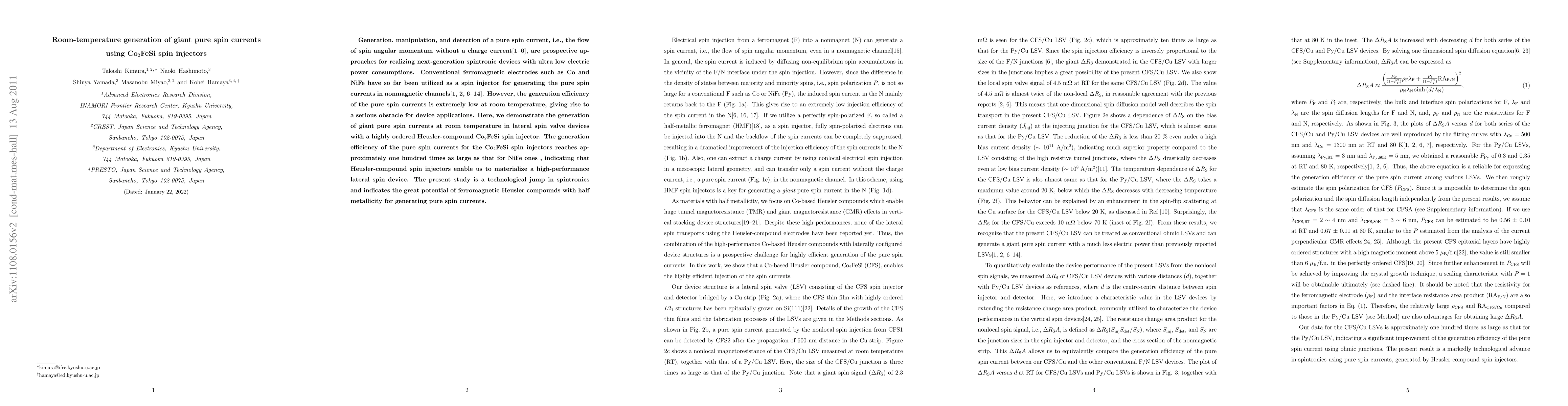 This paper demonstrates the generation of highly efficient pure spin currents at room temperature using Co$_2$FeSi spin injectors in lateral spin valve devices, achieving efficiencies approximately 100 times greater than conventional NiFe spin injectors, thus advancing the potential for low-power spintronic devices.