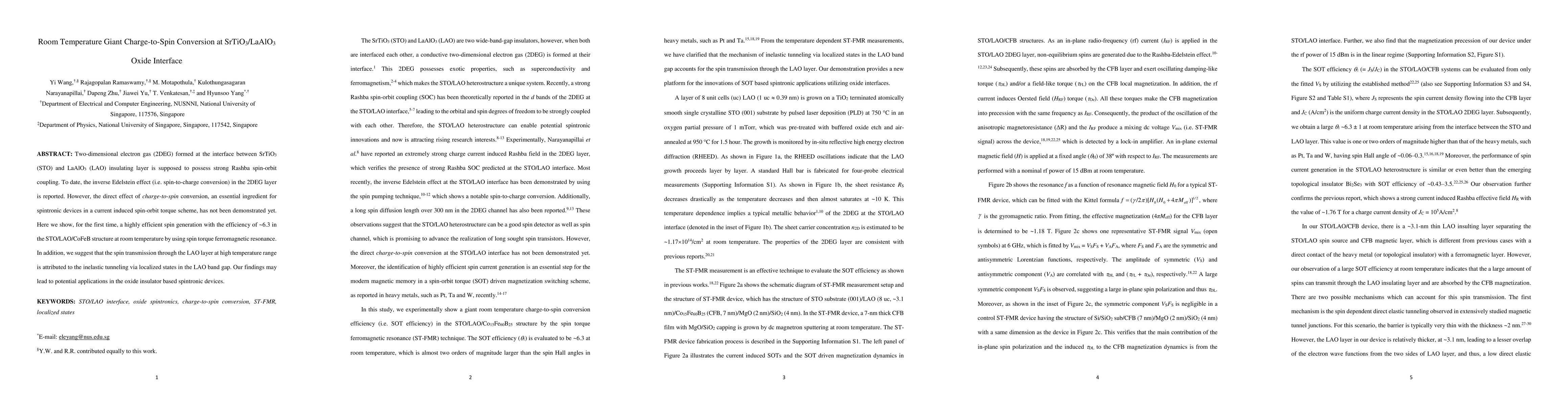 This paper demonstrates the first room temperature giant charge-to-spin conversion at the SrTiO3/LaAlO3 interface, achieving a conversion efficiency of ~6.3 in a STO/LAO/CoFeB structure. The findings suggest potential applications in oxide insulator-based spintronic devices.
