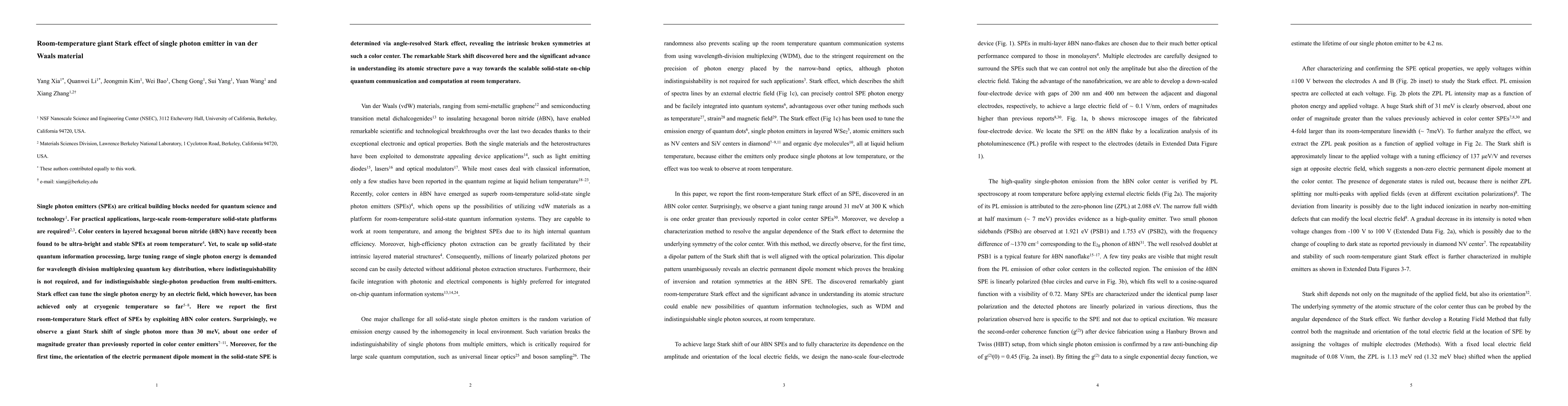 This paper reports the first observation of a room-temperature giant Stark effect in single photon emitters (SPEs) using color centers in hexagonal boron nitride (hBN), achieving a Stark shift over 30 meV, significantly greater than previous reports. This discovery paves the way for scalable, room-temperature quantum communication and computation.
