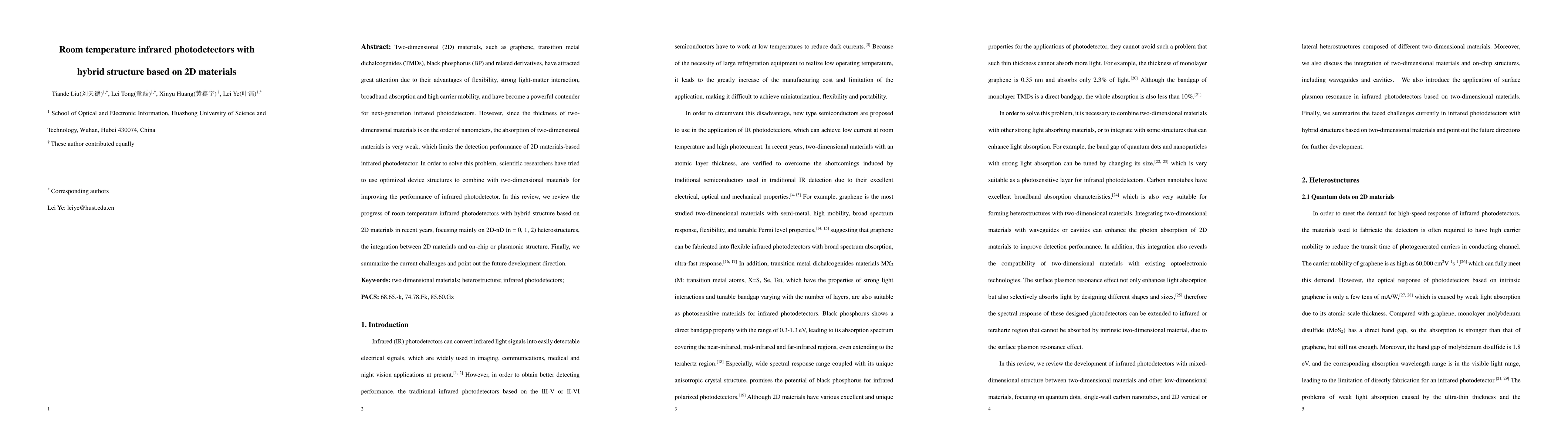 This paper reviews recent advancements in room temperature infrared photodetectors utilizing hybrid structures based on 2D materials, emphasizing 2D-nD heterostructures and integration with on-chip or plasmonic components to enhance detection performance. It highlights current challenges and future directions for development.