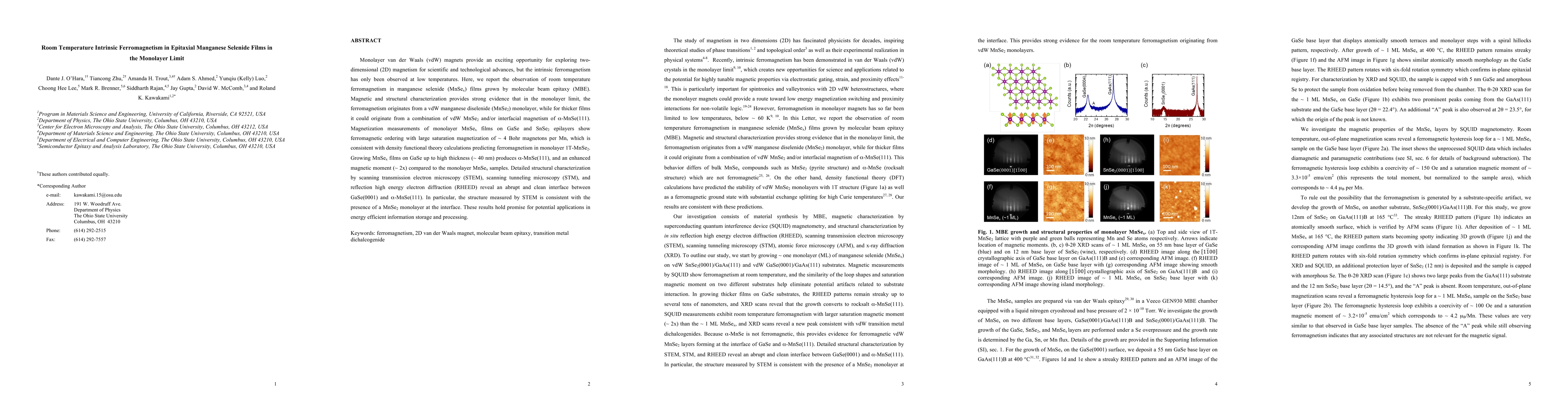 Monolayer van der Waals (vdW) magnets provide an exciting opportunity for exploring two-dimensional (2D) magnetism for scientific and technological advances, but the intrinsic ferromagnetism has only been observed at low temperatures. Here, we report the observation of room temperature ferromagnetism in manganese selenide (MnSe$_x$) films grown by molecular beam epitaxy (MBE). Magnetic and structural characterization provides strong evidence that in the monolayer limit, the ferromagnetism originates from a vdW manganese diselenide (MnSe$_2$) monolayer, while for thicker films it could originate from a combination of vdW MnSe$_2$ and/or interfacial magnetism of $\alpha$-MnSe(111). Magnetization measurements of monolayer MnSe$_x$ films on GaSe and SnSe$_2$ epilayers show ferromagnetic ordering with large saturation magnetization of ~ 4 Bohr magnetons per Mn, which is consistent with density functional theory calculations predicting ferromagnetism in monolayer 1T-MnSe$_2$. Growing MnSe$_x$ films on GaSe up to high thickness (~ 40 nm) produces $\alpha$-MnSe(111), and an enhanced magnetic moment (~ 2x) compared to the monolayer MnSe$_x$ samples. Detailed structural characterization by scanning transmission electron microscopy (STEM), scanning tunneling microscopy (STM), and reflection high energy electron diffraction (RHEED) reveal an abrupt and clean interface between GaSe(0001) and $\alpha$-MnSe(111). In particular, the structure measured by STEM is consistent with the presence of a MnSe$_2$ monolayer at the interface. These results hold promise for potential applications in energy efficient information storage and processing.