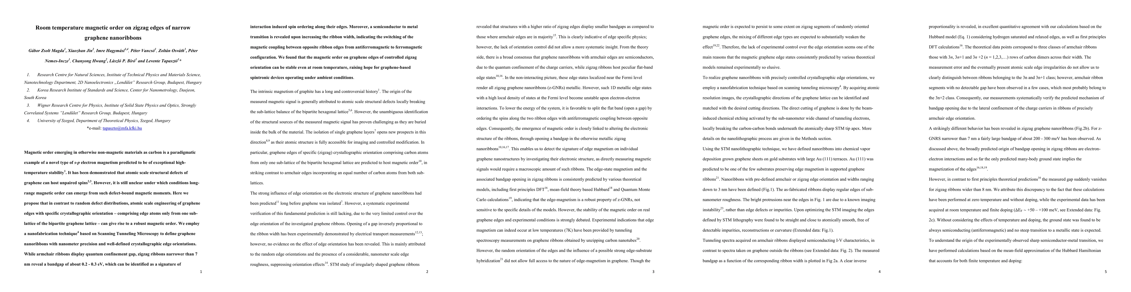 This research demonstrates that zigzag edges of narrow graphene nanoribbons, engineered with atomic precision, exhibit room temperature magnetic order. Using nanofabrication techniques, zigzag ribbons less than 7 nm wide show a bandgap indicative of spin ordering, suggesting potential for graphene-based spintronic applications under ambient conditions.