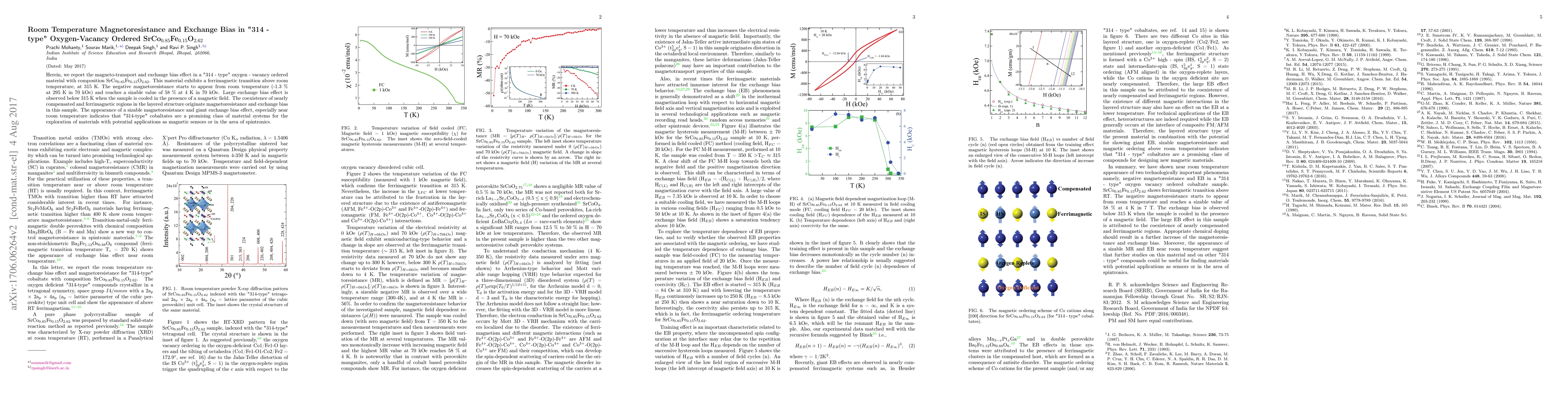 Herein, we report the magneto-transport and exchange bias effect in a "314 - type" oxygen - vacancy ordered material with composition SrCo$_{0.85}$Fe$_{0.15}$O$_{2.62}$. This material exhibits a ferrimagnetic transition above room temperature, at 315 K. The negative magnetoresistance starts to appear from room temperature (-1.3 $\%$ at 295 K in 70 kOe) and reaches a sizable value of 58 $\%$ at 4 K in 70 kOe. Large exchange bias effect is observed below 315 K when the sample is cooled in the presence of a magnetic field. The coexistence of nearly compensated and ferrimagnetic regions in the layered structure originate magnetoresistance and exchange bias in this sample. The appearance of a sizable magnetoresistance and giant exchange bias effect, especially near room temperature indicates that "314-type" cobaltates are a promising class of material systems for the exploration of materials with potential applications as magnetic sensors or in the area of spintronics.