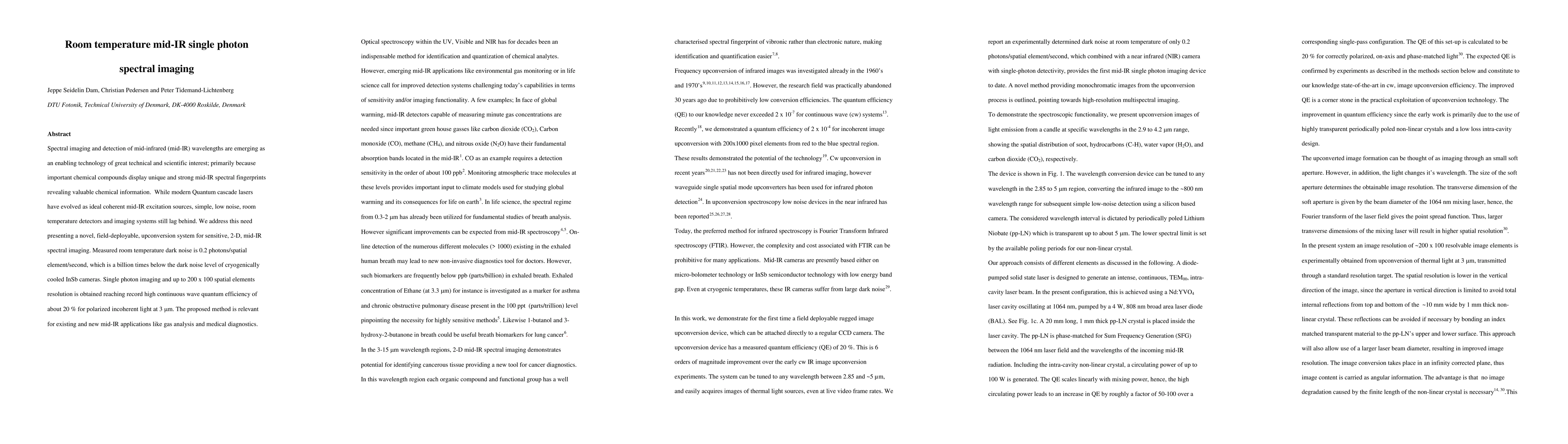 This paper introduces a novel upconversion system for room temperature mid-IR single photon spectral imaging with low dark noise and high quantum efficiency, suitable for applications in gas analysis and medical diagnostics. The method achieves 200 x 100 resolution and a quantum efficiency of 20% for polarized incoherent light at 3 μm.