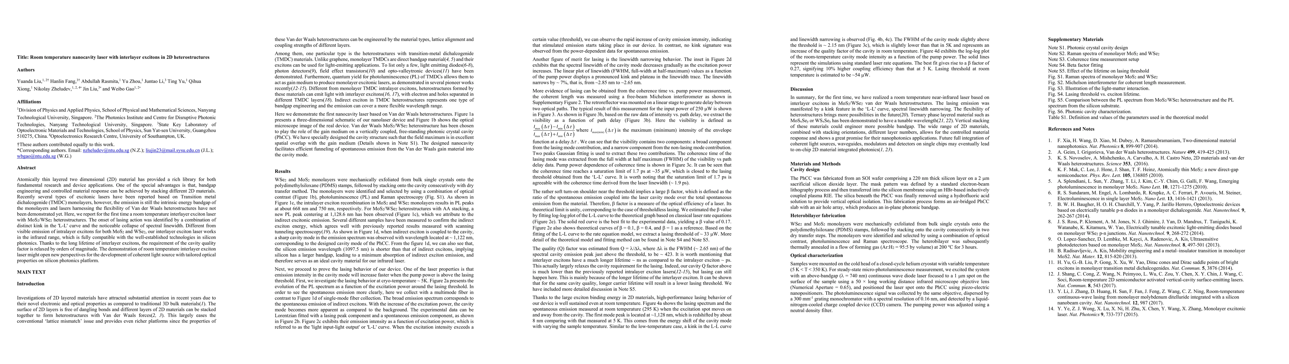 This paper reports the first room temperature interlayer exciton laser using MoS2/WSe2 heterostructures, demonstrating lasing in the infrared range compatible with silicon photonics. The long interlayer exciton lifetime reduces the cavity quality factor requirement significantly.