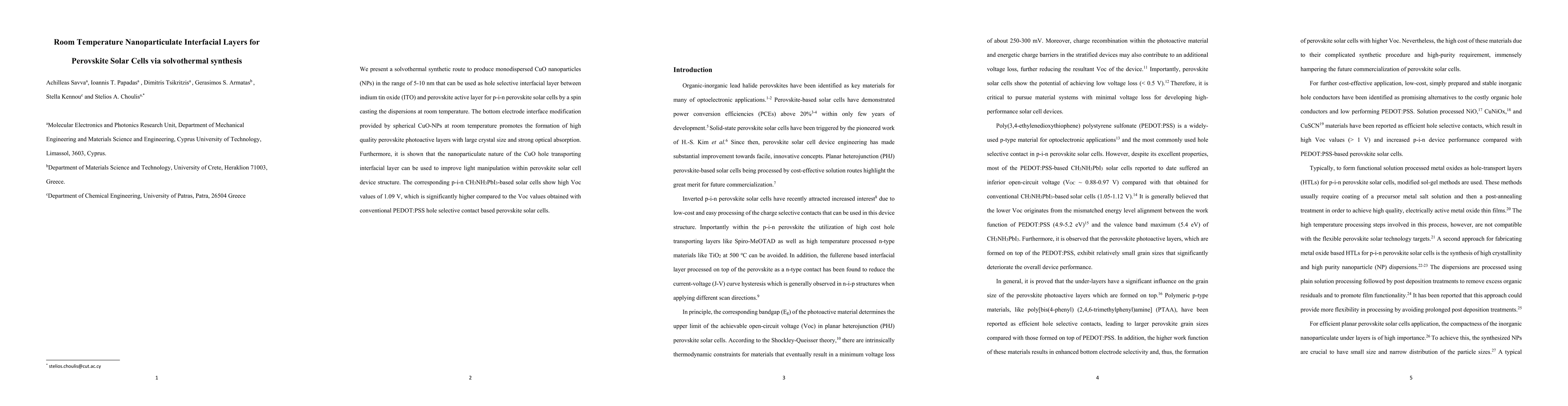 This paper details a solvothermal method for creating monodispersed CuO nanoparticles used as a hole-selective interfacial layer in perovskite solar cells, achieving high open-circuit voltages and improved light manipulation. The CuO nanoparticles enhance the quality of perovskite layers and outperform conventional PEDOT:PSS contacts.