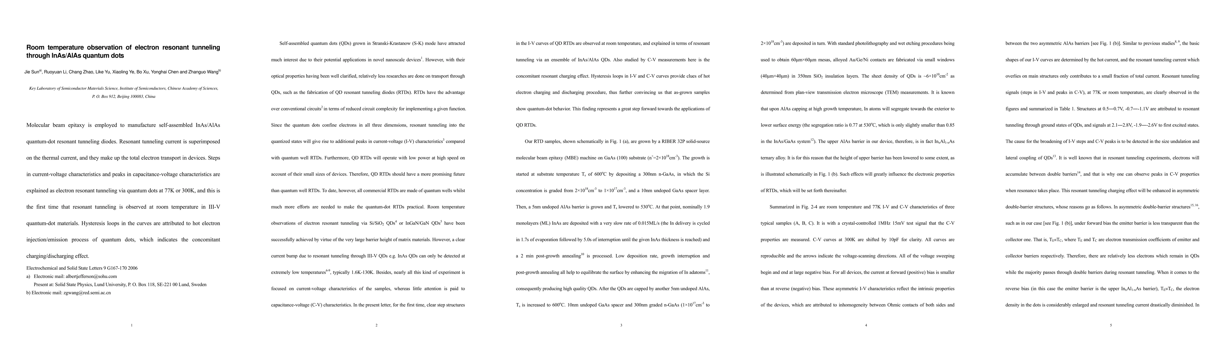 This study fabricates InAs/AlAs quantum-dot resonant tunneling diodes using molecular beam epitaxy, observing electron resonant tunneling at both 77K and 300K, marking the first room-temperature observation in III-V quantum-dot materials. Hysteresis loops are linked to hot electron injection/emission processes in the quantum dots.