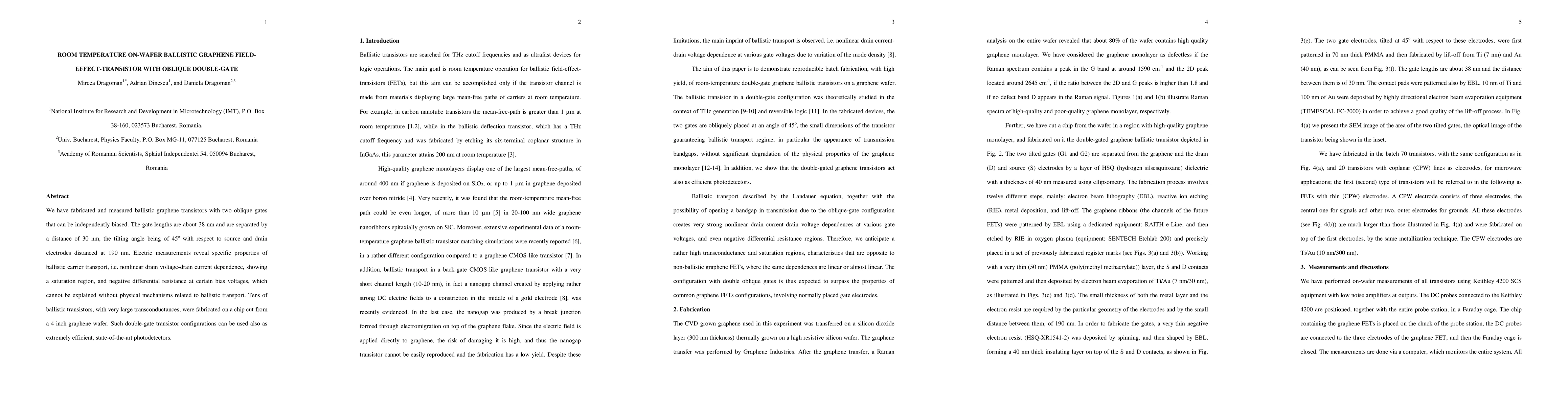 We have fabricated and measured ballistic graphene transistors with two oblique gates that can be independently biased. The gate lengths are about 38 nm and are separated by a distance of 30 nm, the tilting angle being of 45o with respect to source and drain electrodes distanced at 190 nm. Electric measurements reveal specific properties of ballistic carrier transport, i.e. nonlinear drain voltage-drain current dependence, showing a saturation region, and negative differential resistance at certain bias voltages, which cannot be explained without physical mechanisms related to ballistic transport. Tens of ballistic transistors, with very large transconductances, were fabricated on a chip cut from a 4 inch graphene wafer. Such double-gate transistor configurations can be used also as extremely efficient, state-of-the-art photodetectors.