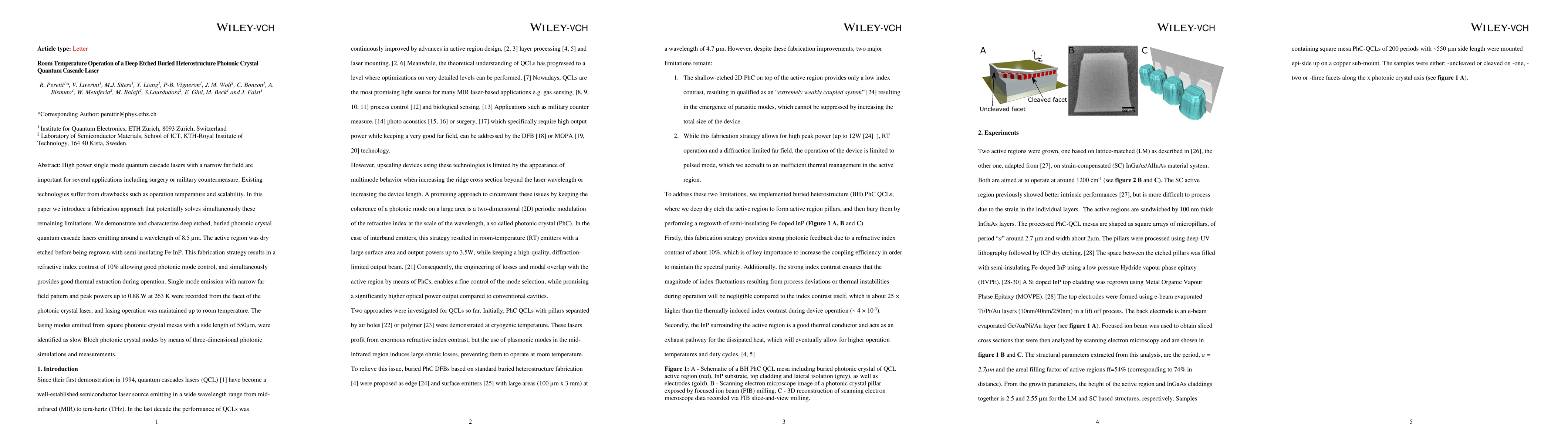 This paper presents a novel fabrication method for buried heterostructure photonic crystal quantum cascade lasers that operate at room temperature, achieving high power single mode emission with a narrow far field. The approach involves deep etching and regrowth with semi-insulating Fe:InP, enabling efficient thermal extraction and a 10% refractive index contrast, resulting in peak powers of 0.88 W at 263 K.