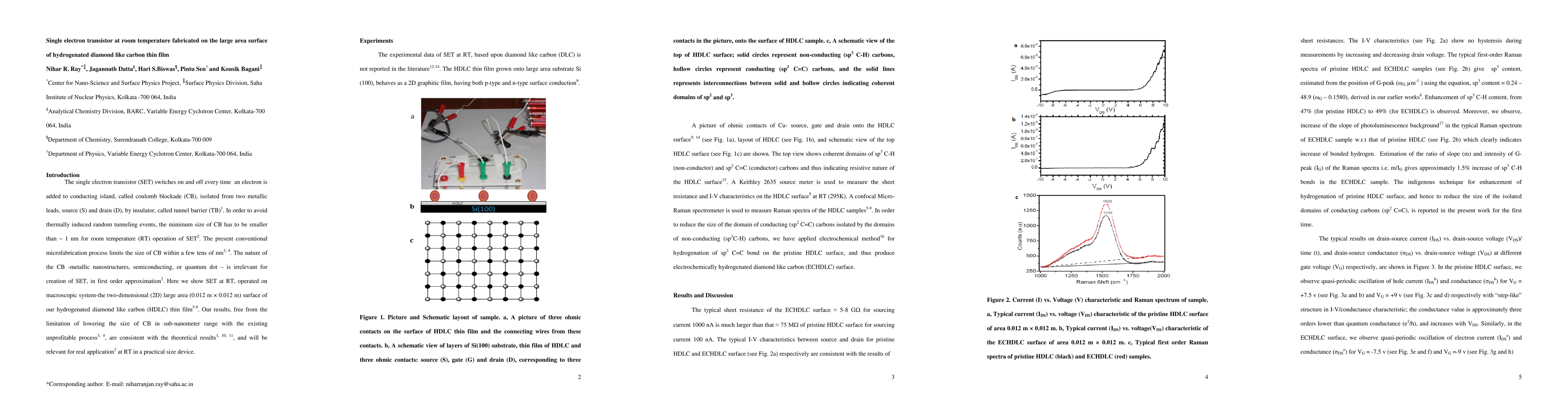 This paper shows single electron transistor at room temperature,created on macroscopic system-the two-dimensional large area surface of our hydrogenated diamond like carbon thin film. Our results, free from the limitation of lowering the size of coulomb blockade in sub-nanometer range with the existing unprofitable process,are consistent with the theoretical results and will be relevant for future practical applications in the realm of atomic physics, quantum phenomenon and metrology.