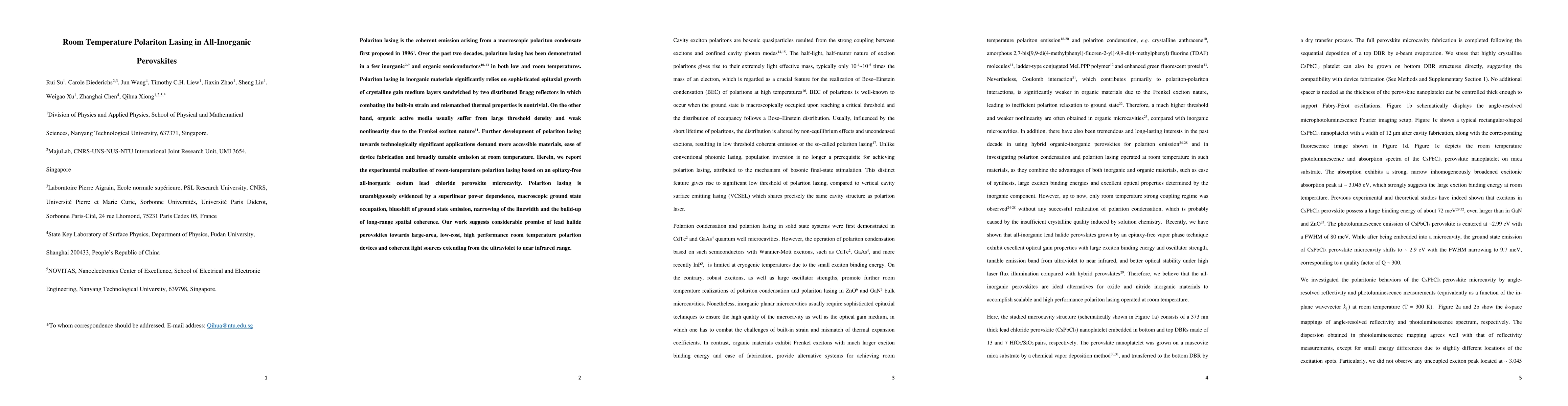 This paper reports the first experimental realization of room-temperature polariton lasing in an all-inorganic cesium lead chloride perovskite microcavity without the need for epitaxial growth. The findings demonstrate the material's potential for low-cost, high-performance, and broadly tunable polariton devices.