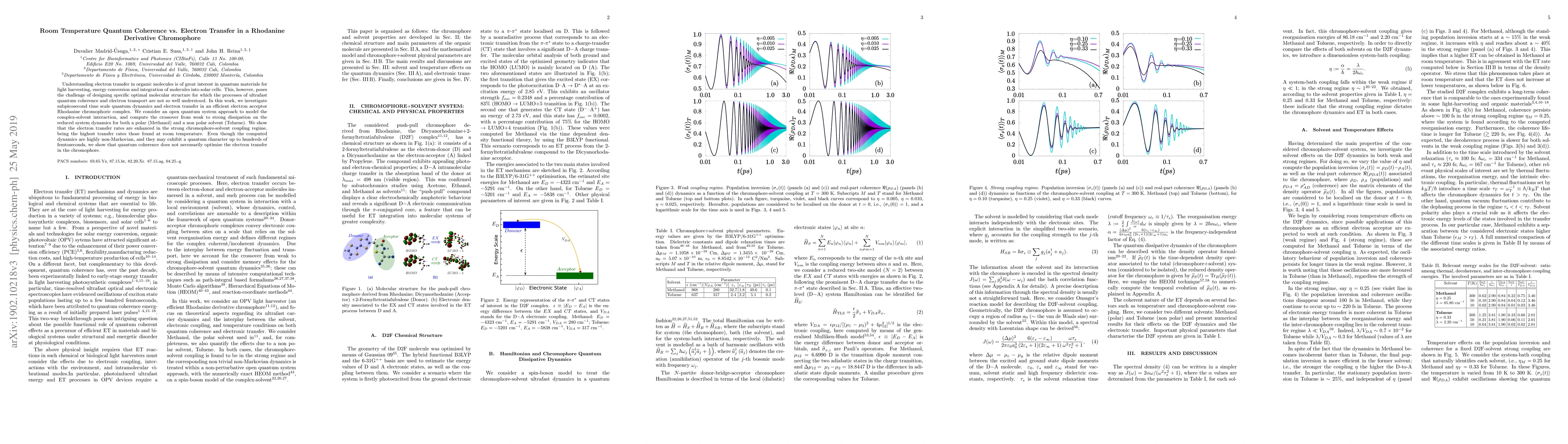 This paper investigates the quantum dynamics and electron transfer in a Rhodanine derivative chromophore, finding that electron transfer rates are highest at room temperature despite quantum coherence potentially lasting hundreds of femtoseconds. The study shows that strong chromophore-solvent coupling enhances electron transfer, but quantum coherence does not necessarily optimize this process.