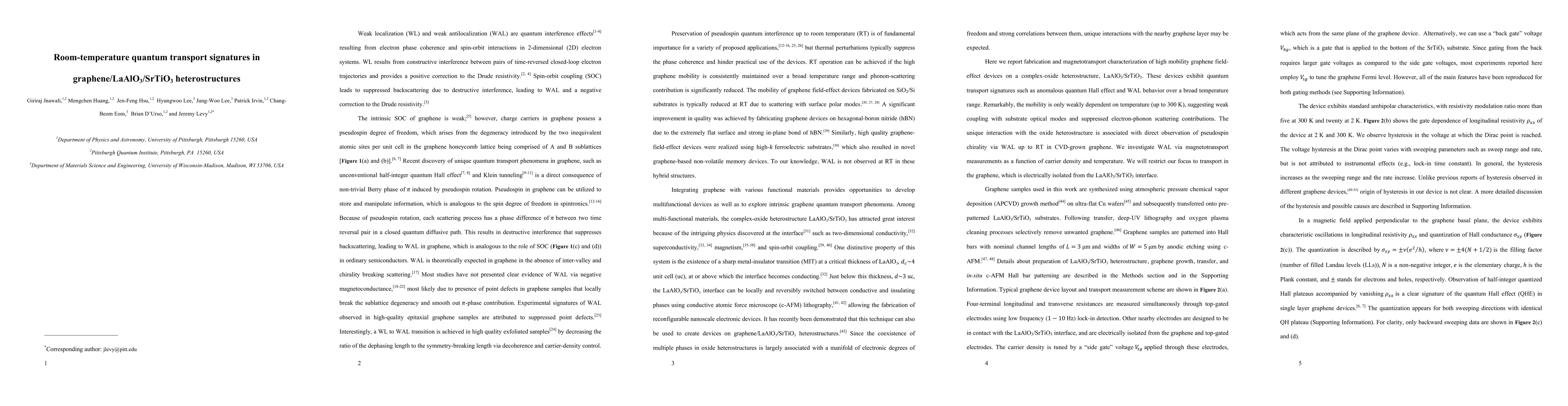 This paper reports the successful fabrication and characterization of graphene devices on LaAlO3/SrTiO3 heterostructures, where pseudospin quantum interference effects like weak antilocalization persist up to room temperature, facilitated by the substrate's ability to suppress impurity scattering and electron-phonon coupling.