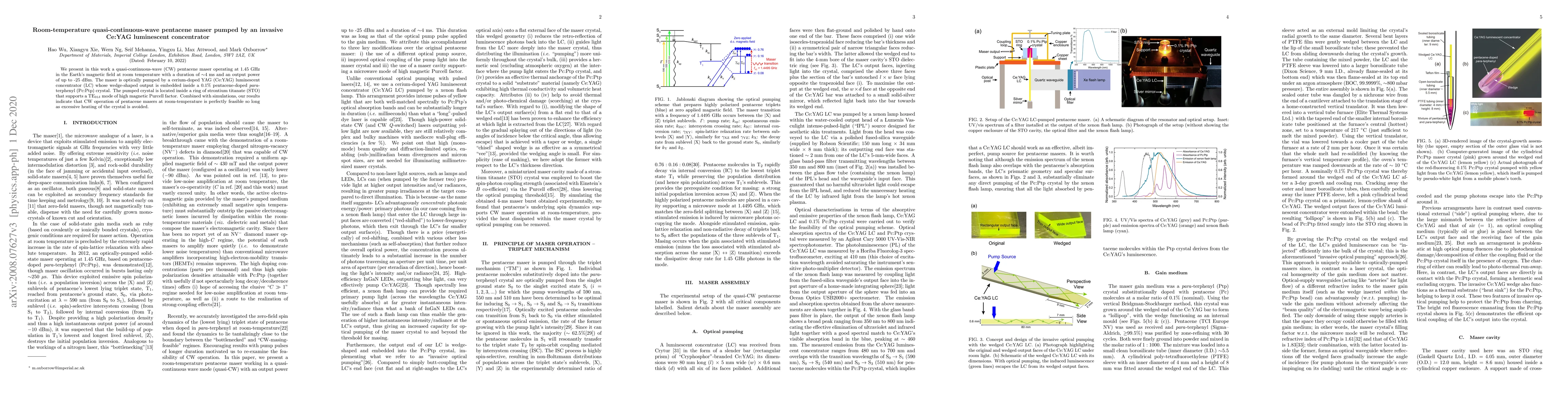 This research demonstrates a quasi-continuous-wave pentacene maser operating at room temperature and 1.45 GHz, achieving a 4 ms duration and -25 dBm output power. It is optically pumped by a Ce:YAG luminescent concentrator, showing that room-temperature CW operation is feasible if overheating is prevented.