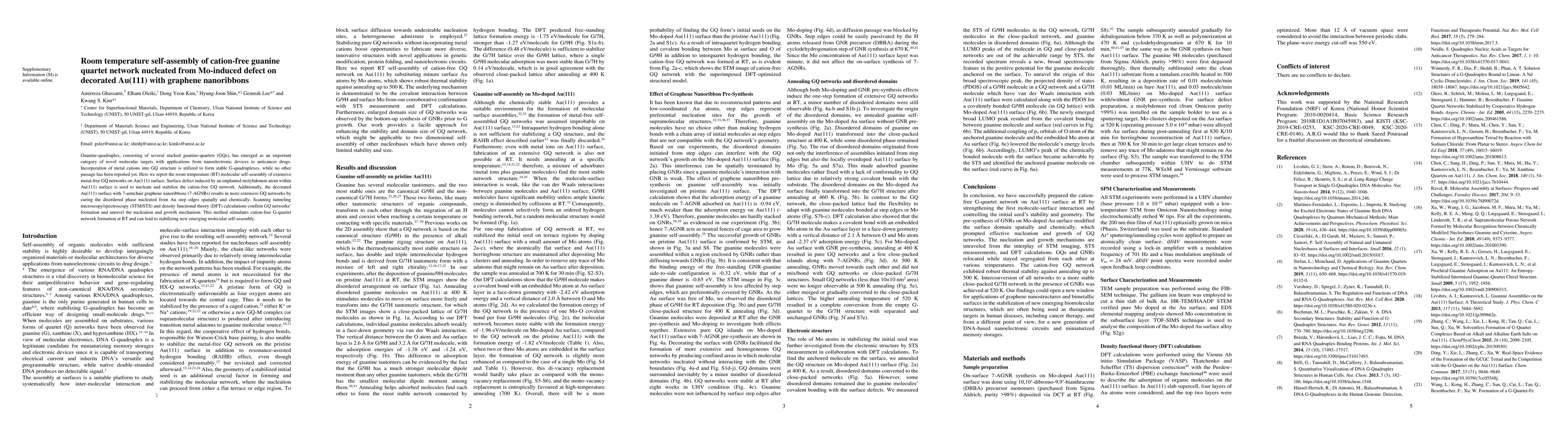 This paper reports the room temperature self-assembly of extensive cation-free guanine quartet networks on a decorated Au(111) surface, nucleated by a Mo-induced defect and enhanced by graphene nanoribbons. STM/STS and DFT confirm the formation and growth mechanism, offering a new method for stabilizing molecular self-assembly.