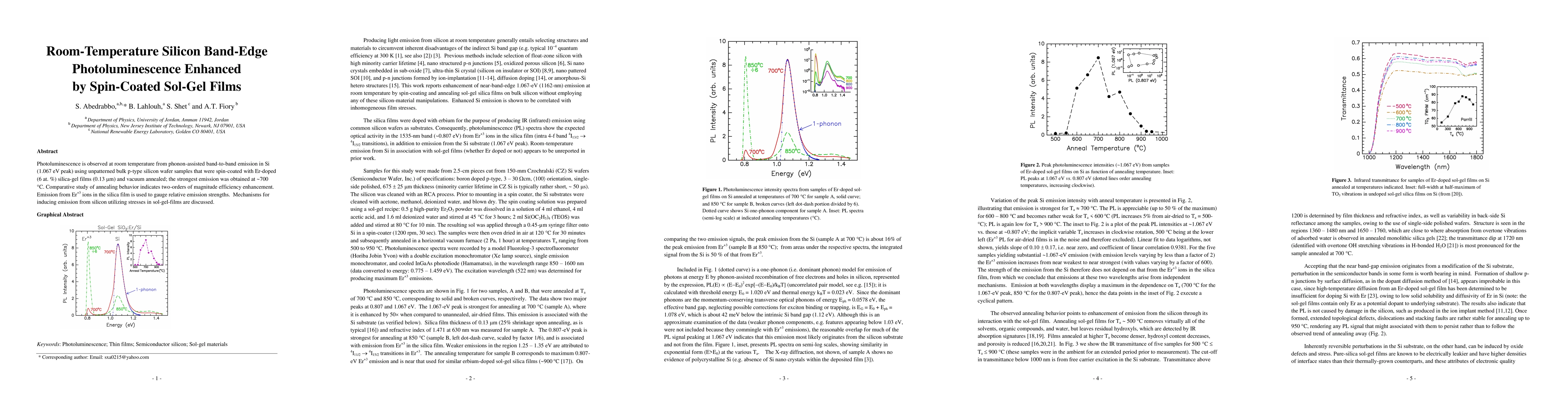 This research reports on the enhancement of room-temperature silicon band-edge photoluminescence through the application of spin-coated Er-doped silica-gel films, achieving significant efficiency improvements via optimized annealing processes. The study demonstrates a two-orders of magnitude increase in emission efficiency, attributing the effect to stress-induced mechanisms in the sol-gel films.