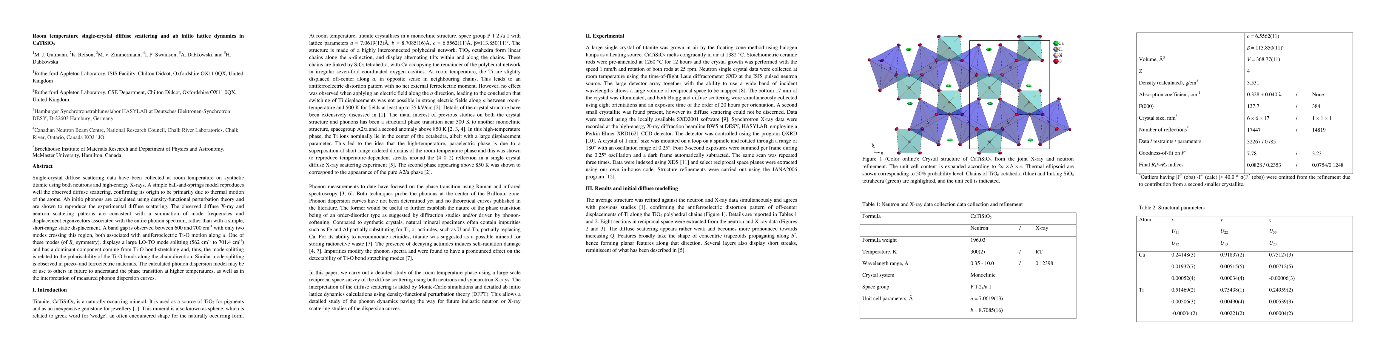Researchers studied CaTiSiO5 using neutron and X-ray scattering to understand its diffuse scattering patterns at room temperature. They found a band gap between 600-700 cm^-1 with two modes crossing the region, related to Ti-O motion and polarizability of the Ti-O bonds.
