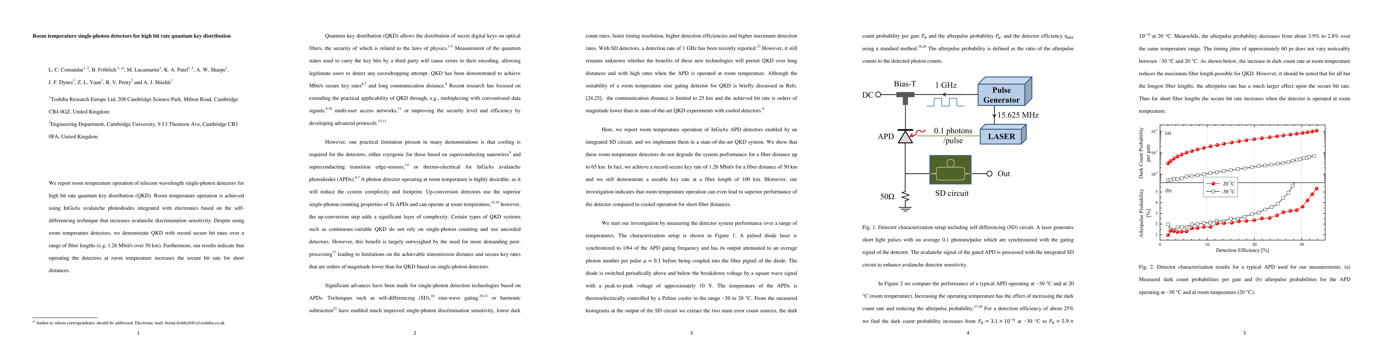 This paper reports the development of room temperature single-photon detectors using InGaAs avalanche photodiodes for high bit rate quantum key distribution (QKD), achieving record secure bit rates over long distances (e.g., 1.26 Mbit/s over 50 km) and demonstrating increased secure bit rate for short distances.