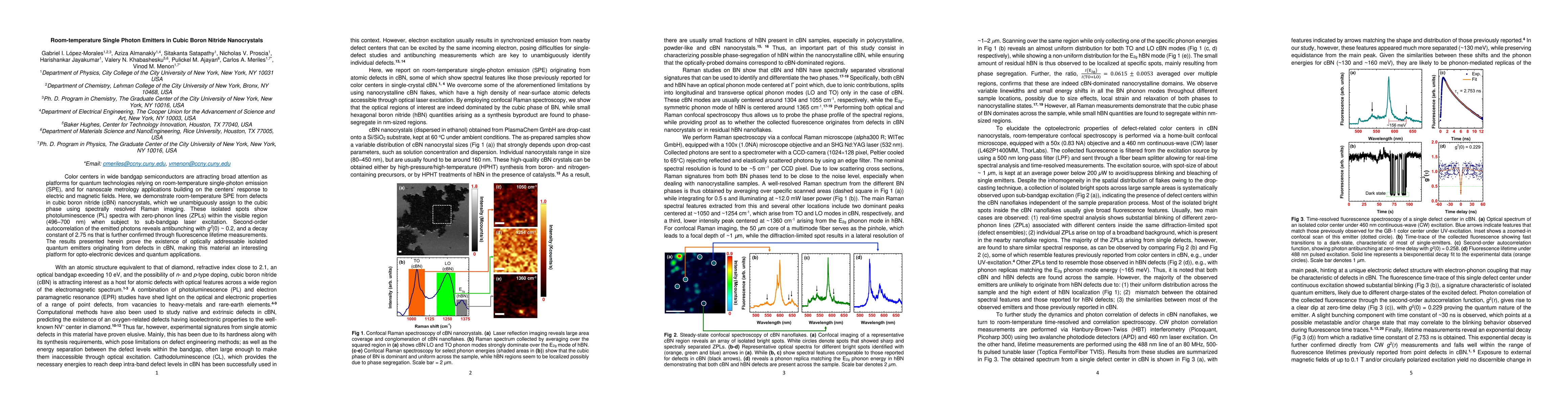 This paper demonstrates room-temperature single-photon emission from defects in cubic boron nitride nanocrystals, confirmed via spectrally resolved Raman imaging and characterized by zero-phonon line photoluminescence spectra. The isolated quantum emitters exhibit antibunching and a decay constant, indicating potential for opto-electronic and quantum technologies.