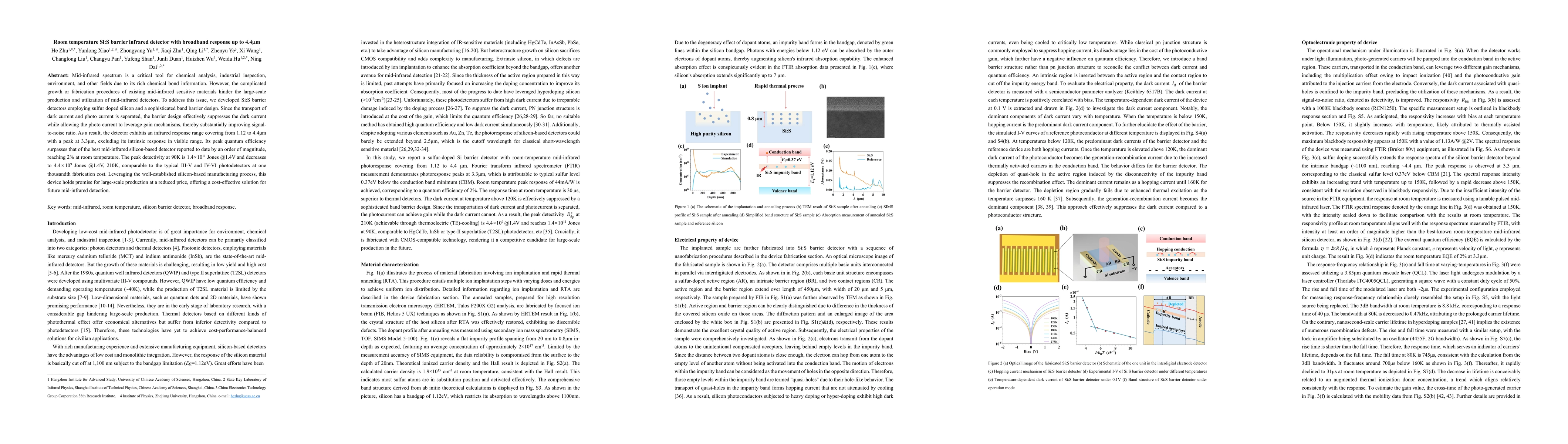 This paper presents a Si:S barrier infrared detector with a broadband response up to 4.4 μm, significantly enhancing the signal-to-noise ratio through a sophisticated band barrier design that separates dark and photo current transport. The detector achieves superior quantum efficiency and detectivity, promising cost-effective large-scale production using silicon-based manufacturing.