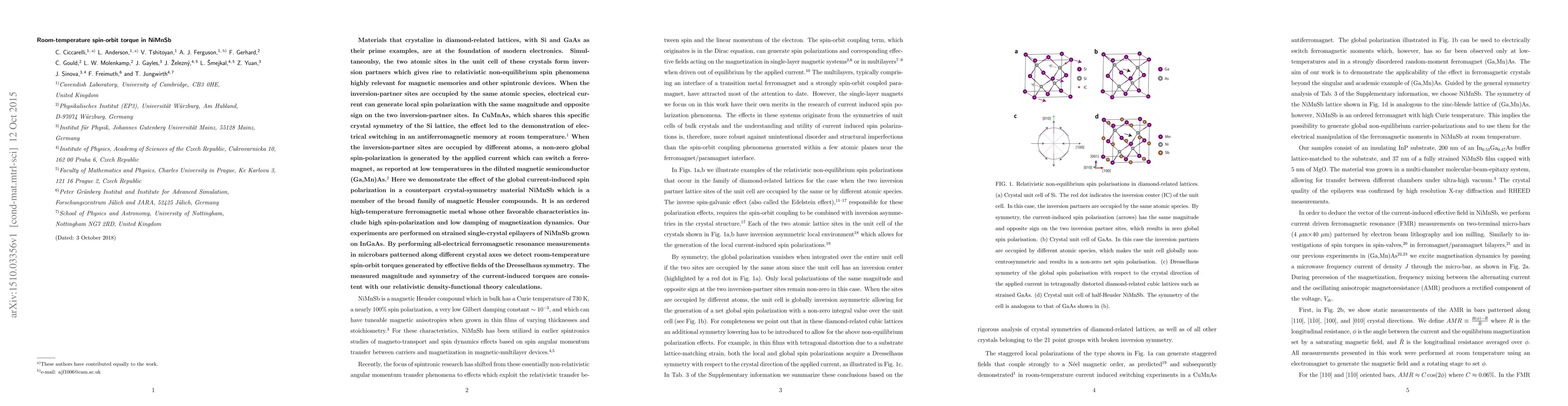 Materials that crystalize in diamond-related lattices, with Si and GaAs as their prime examples, are at the foundation of modern electronics. Simultaneoulsy, the two atomic sites in the unit cell of these crystals form inversion partners which gives rise to relativistic non-equilibrium spin phenomena highly relevant for magnetic memories and other spintronic devices. When the inversion-partner sites are occupied by the same atomic species, electrical current can generate local spin polarization with the same magnitude and opposite sign on the two inversion-partner sites. In CuMnAs, which shares this specific crystal symmetry of the Si lattice, the effect led to the demonstration of electrical switching in an antiferromagnetic memory at room temperature. When the inversion-partner sites are occupied by different atoms, a non-zero global spin-polarization is generated by the applied current which can switch a ferromagnet, as reported at low temperatures in the diluted magnetic semiconductor (Ga,Mn)As. Here we demonstrate the effect of the global current-induced spin polarization in a counterpart crystal-symmetry material NiMnSb which is a member of the broad family of magnetic Heusler compounds. It is an ordered high-temperature ferromagnetic metal whose other favorable characteristics include high spin-polarization and low damping of magnetization dynamics. Our experiments are performed on strained single-crystal epilayers of NiMnSb grown on InGaAs. By performing all-electrical ferromagnetic resonance measurements in microbars patterned along different crystal axes we detect room-temperature spin-orbit torques generated by effective fields of the Dresselhaus symmetry. The measured magnitude and symmetry of the current-induced torques are consistent with our relativistic density-functional theory calculations.