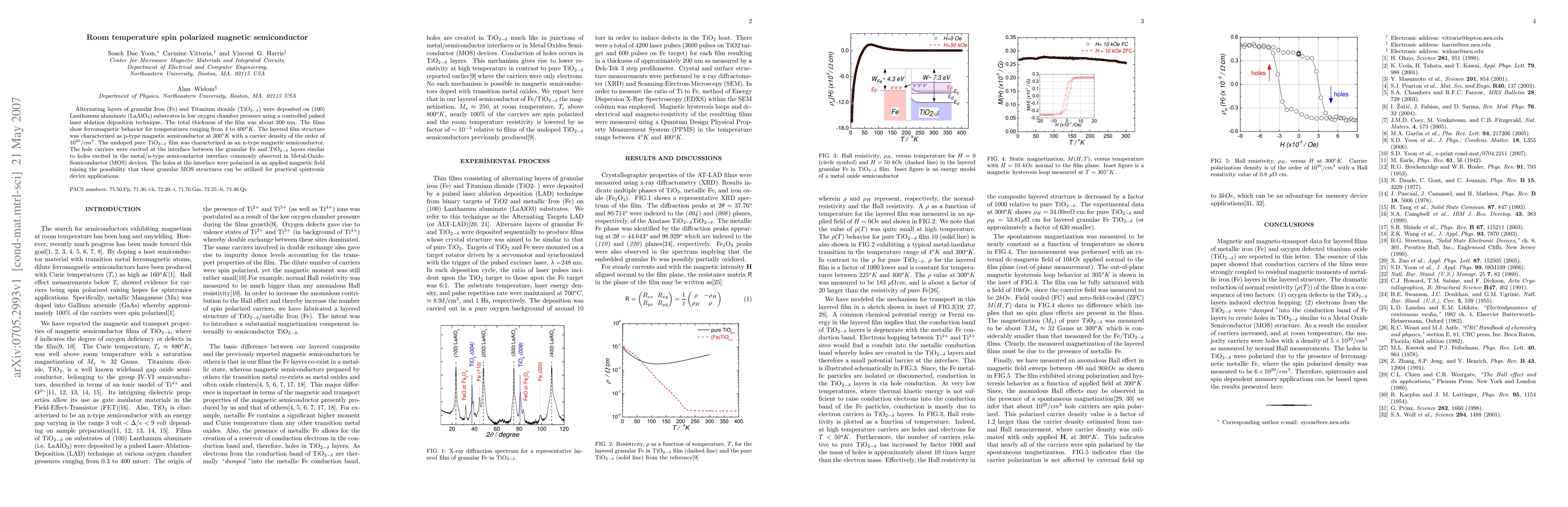 Alternating layers of granular Iron (Fe) and Titanium dioxide (TiO$_{2-\delta}$) were deposited on (100) Lanthanum aluminate (LaAlO$_3$) substrates in low oxygen chamber pressure using a controlled pulsed laser ablation deposition technique. The total thickness of the film was about 200 nm. The films show ferromagnetic behavior for temperatures ranging from 4 to $400 ^oK$. The layered film structure was characterized as p-type magnetic semiconductor at $300 ^oK$ with a carrier density of the order of $10^{20} /cm^3$. The undoped pure TiO$_{2-\delta}$ film was characterized as an n-type magnetic semiconductor. The hole carriers were excited at the interface between the granular Fe and TiO$_{2-\delta}$ layers similar to holes excited in the metal/n-type semiconductor interface commonly observed in Metal-Oxide-Semiconductor (MOS) devices. The holes at the interface were polarized in an applied magnetic field raising the possibility that these granular MOS structures can be utilized for practical spintronic device applications.