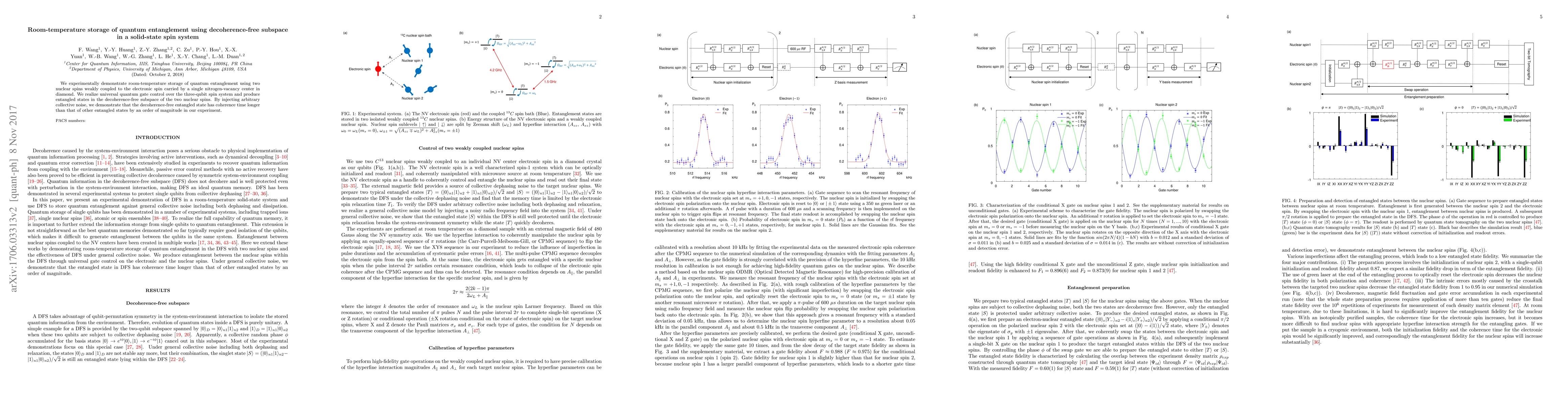 This paper demonstrates room-temperature storage of quantum entanglement using a solid-state spin system in diamond, where nuclear spins coupled to a nitrogen-vacancy center maintain entanglement within a decoherence-free subspace, showing significantly longer coherence times compared to other entangled states.