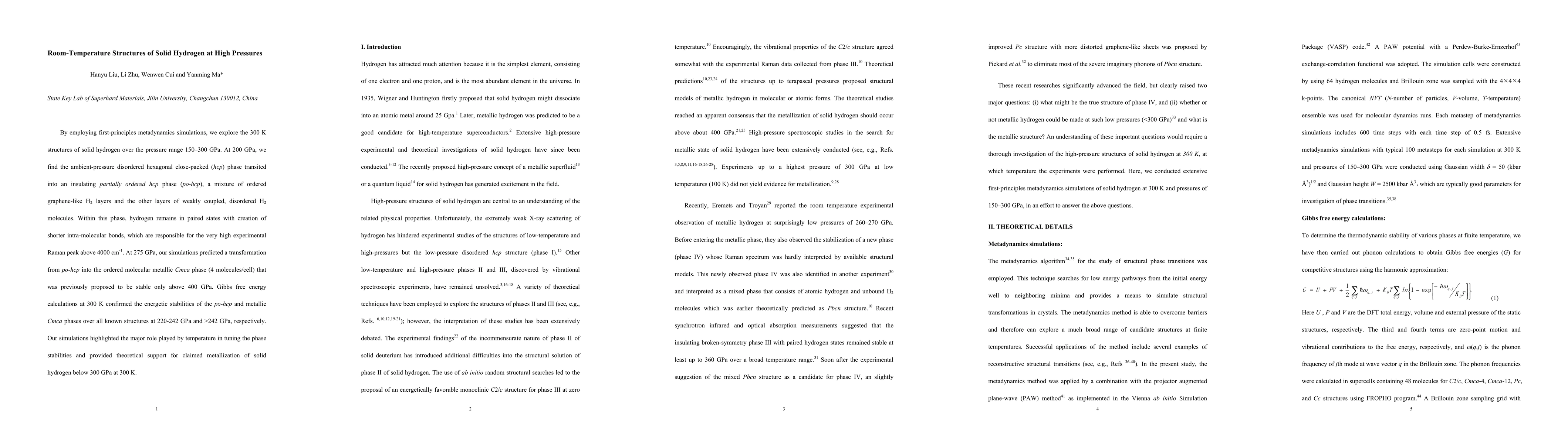 This study uses first-principles metadynamics simulations to investigate solid hydrogen structures at room temperature under high pressures (150-300 GPa). It reveals a transition from disordered hexagonal close-packed to a partially ordered phase at 200 GPa, and further to an ordered metallic phase at 275 GPa, challenging previous metallization pressure estimates.
