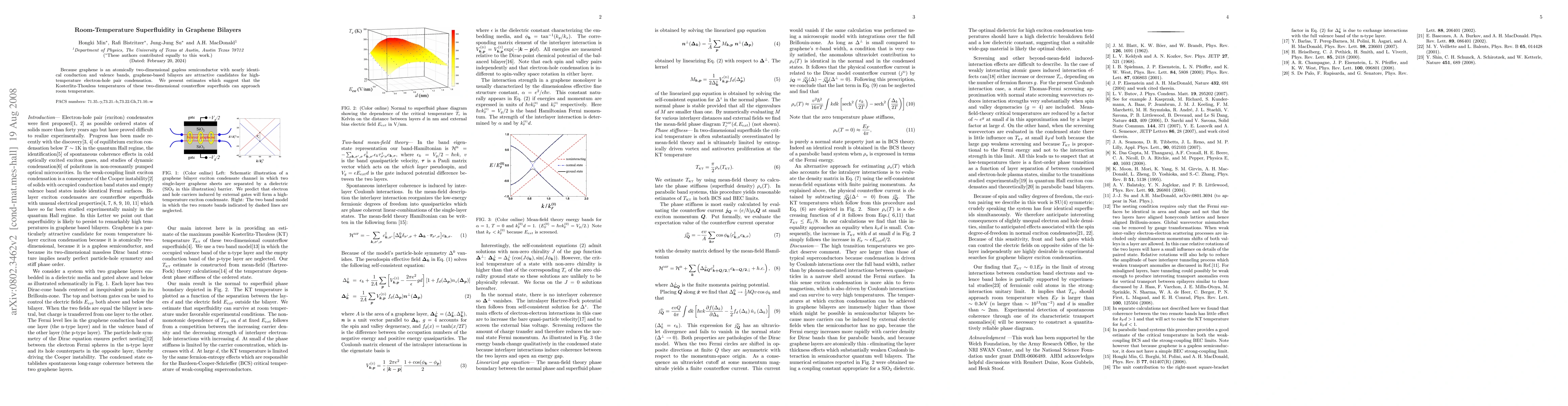 Summary: This paper investigates graphene bilayers, proposing that they could exhibit superfluidity at room temperature due to their unique electronic properties, supported by theoretical estimates indicating high Kosterlitz-Thouless transition temperatures.