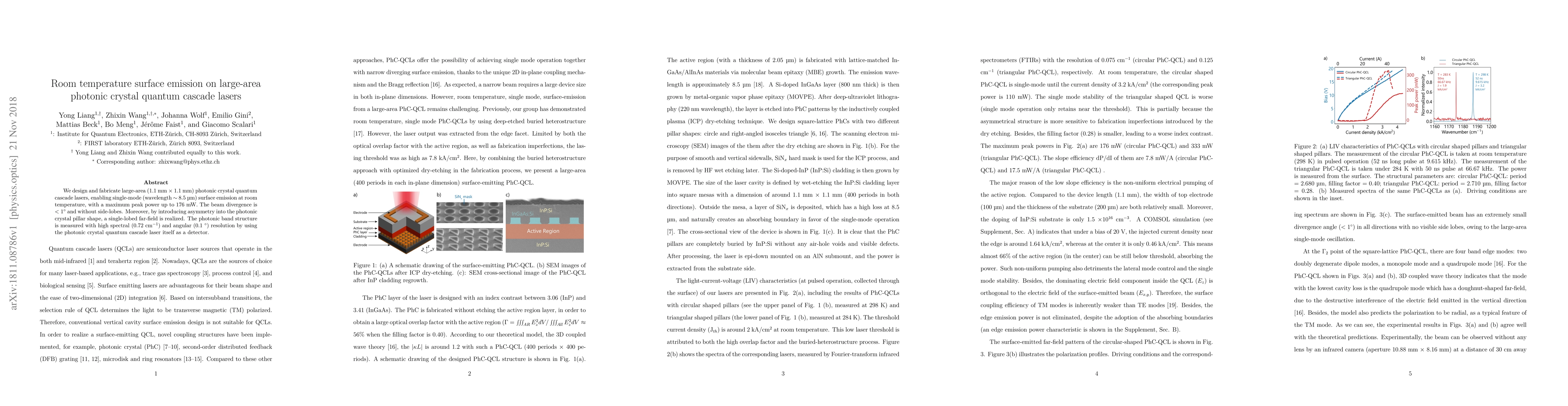 This paper details the design and fabrication of large-area photonic crystal quantum cascade lasers that achieve single-mode surface emission at room temperature, with high peak power and minimal divergence. The asymmetric photonic crystal pillar shape produces a single-lobed far-field pattern, and the photonic band structure is precisely measured using the laser itself as a detector.
