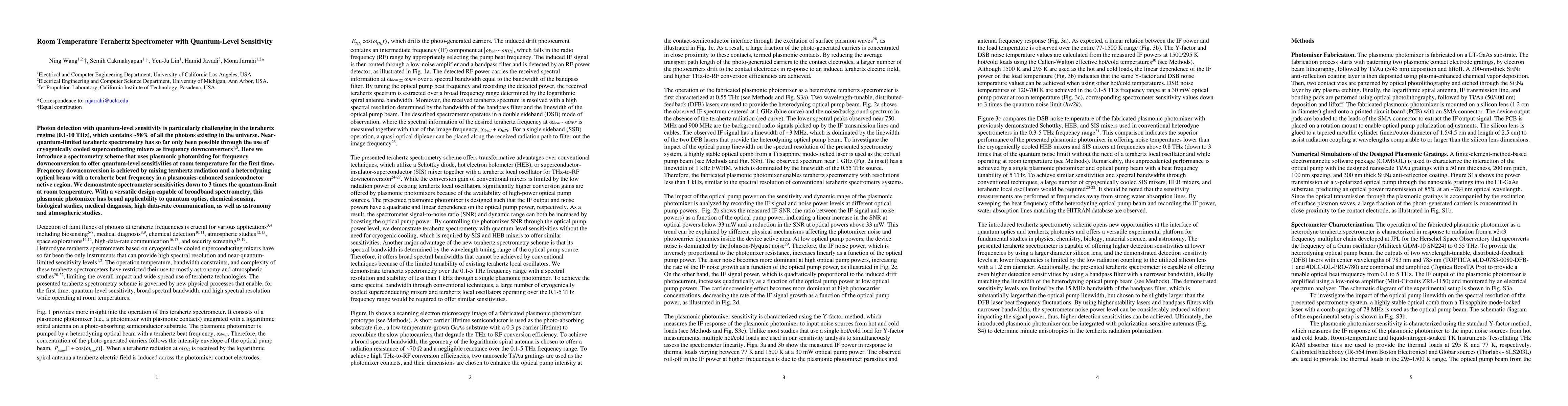 This paper presents a novel room temperature terahertz spectrometer achieving quantum-level sensitivity through plasmonic photomixing, enabling broadband spectrometry with applications ranging from quantum optics to medical diagnosis. The design achieves sensitivities down to 3 times the quantum limit without the need for cryogenic cooling.