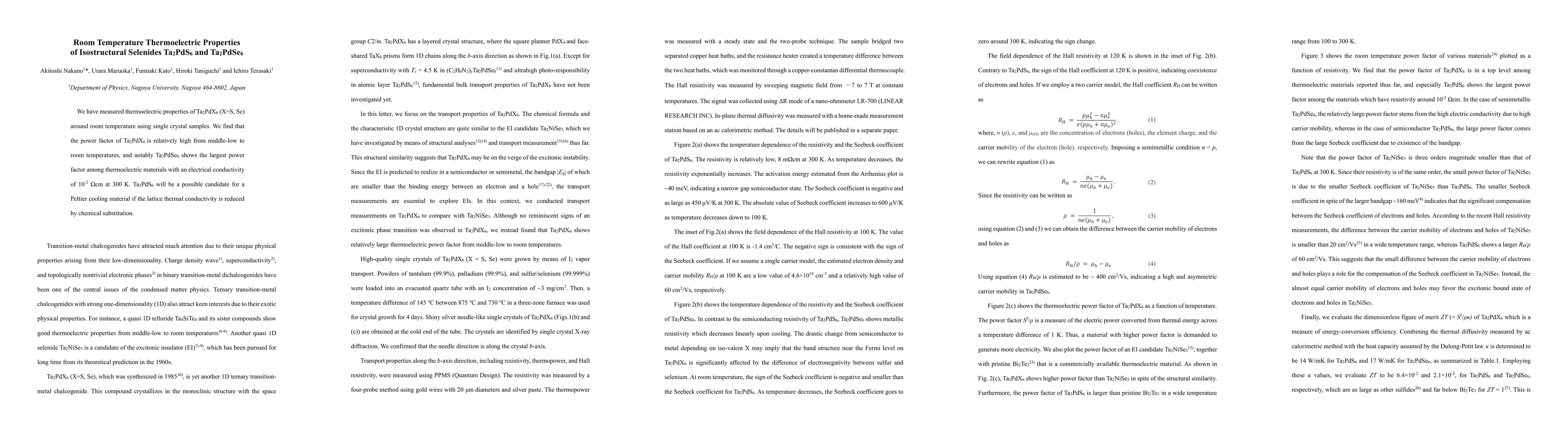 This paper investigates the thermoelectric properties of Ta2PdS6 and Ta2PdSe6 at room temperature, finding Ta2PdSe6 has the highest power factor among thermoelectric materials, while Ta2PdS6 shows potential for Peltier cooling if its lattice thermal conductivity is reduced.