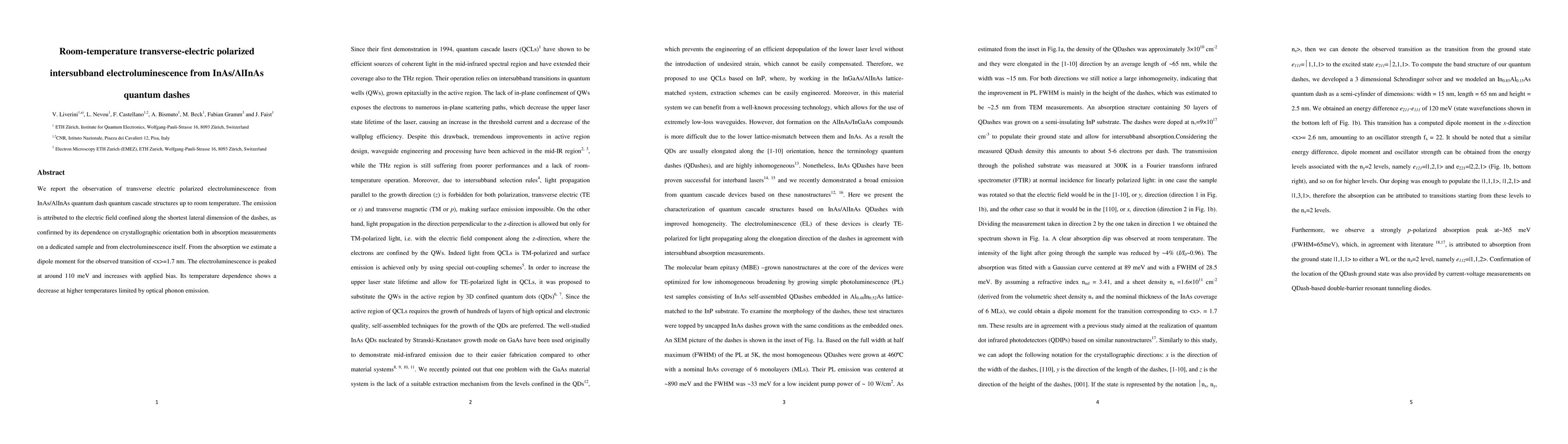 This paper reports room-temperature transverse electric polarized electroluminescence from InAs/AlInAs quantum dash quantum cascade structures, attributed to the electric field confined within the shortest lateral dimension of the dashes. The electroluminescence peaks at 110 meV and decreases with increasing temperature due to optical phonon emission.
