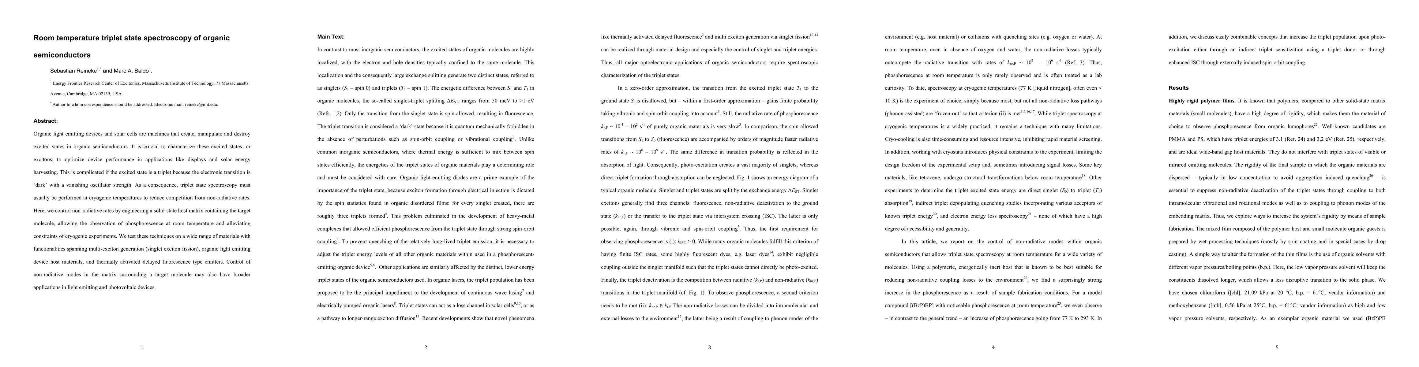 This paper presents a novel method for room temperature triplet state spectroscopy in organic semiconductors, enabling the observation of phosphorescence without cryogenic cooling. The technique involves engineering a solid-state host matrix to control non-radiative decay rates, which is tested across various materials including those for multi-exciton generation and organic light emitting devices.
