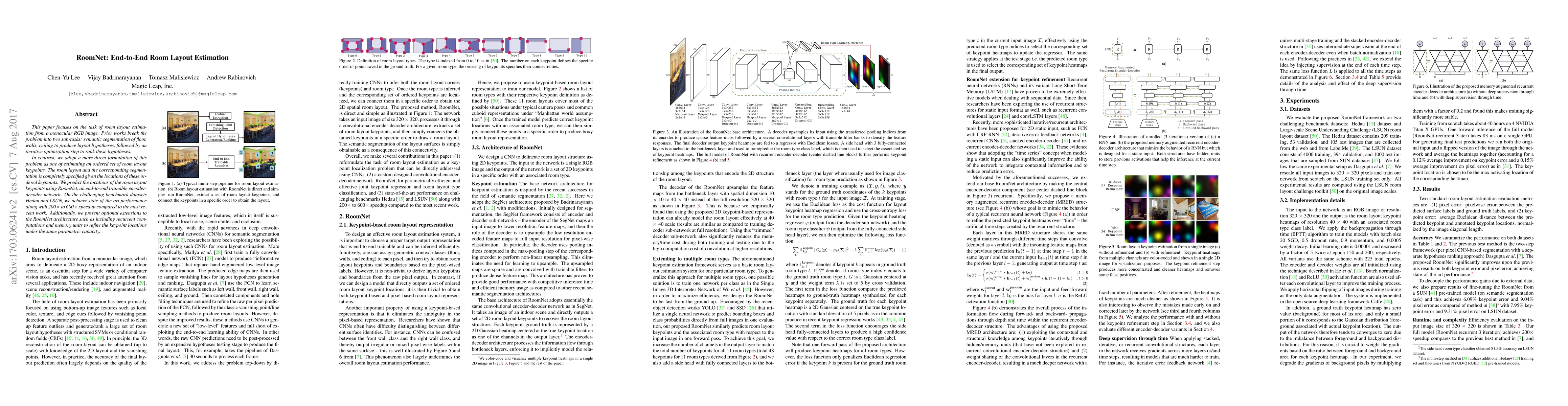 RoomNet introduces an end-to-end trainable encoder-decoder network architecture for room layout estimation, along with a recurrent extension (MRED) that refines keypoint locations iteratively.