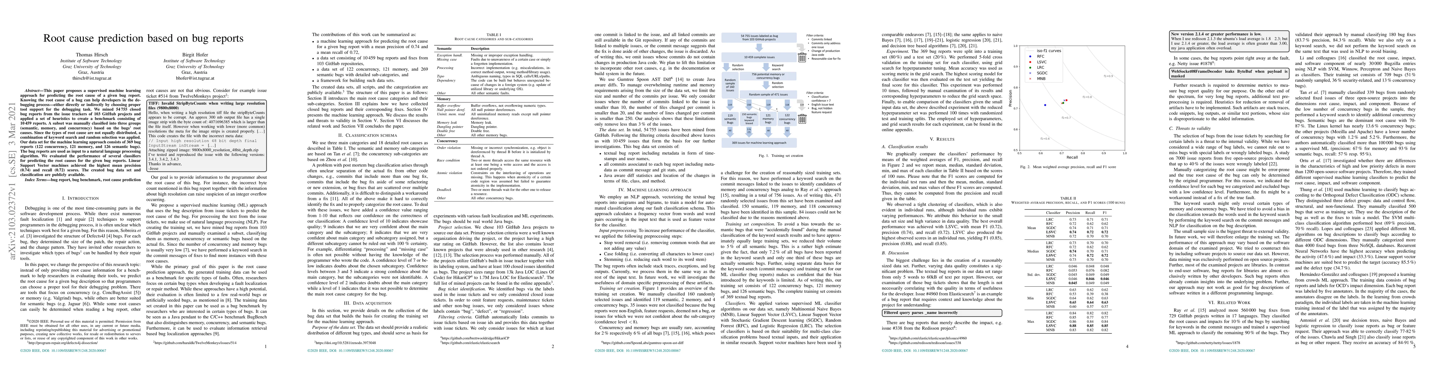 This paper introduces a supervised machine learning method to predict the root cause of bug reports, using a dataset of 54,755 closed bug reports from GitHub projects. Linear Support Vector Machines achieved the best performance with a mean precision of 0.74 and recall of 0.72.