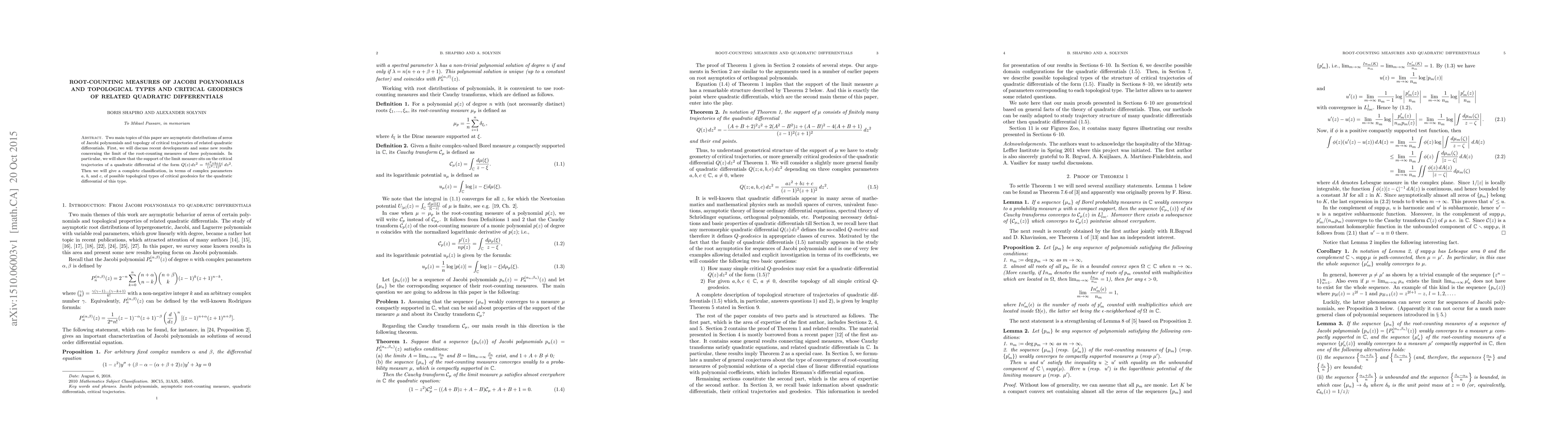Two main topics of this paper are asymptotic distributions of zeros of Jacobi polynomials and topology of critical trajectories of related quadratic differentials. First, we will discuss recent developments and some new results concerning the limit of the root-counting measures of these polynomials. In particular, we will show that the support of the limit measure sits on the critical trajectories of a quadratic differential of the form Q(z)dz^2=(az^2+bz+c)dz^2/(z^2-1)^2. Then we will give a complete classification, in terms of complex parameters a, b, and c, of possible topological types of critical geodesics for the quadratic differential of this type.