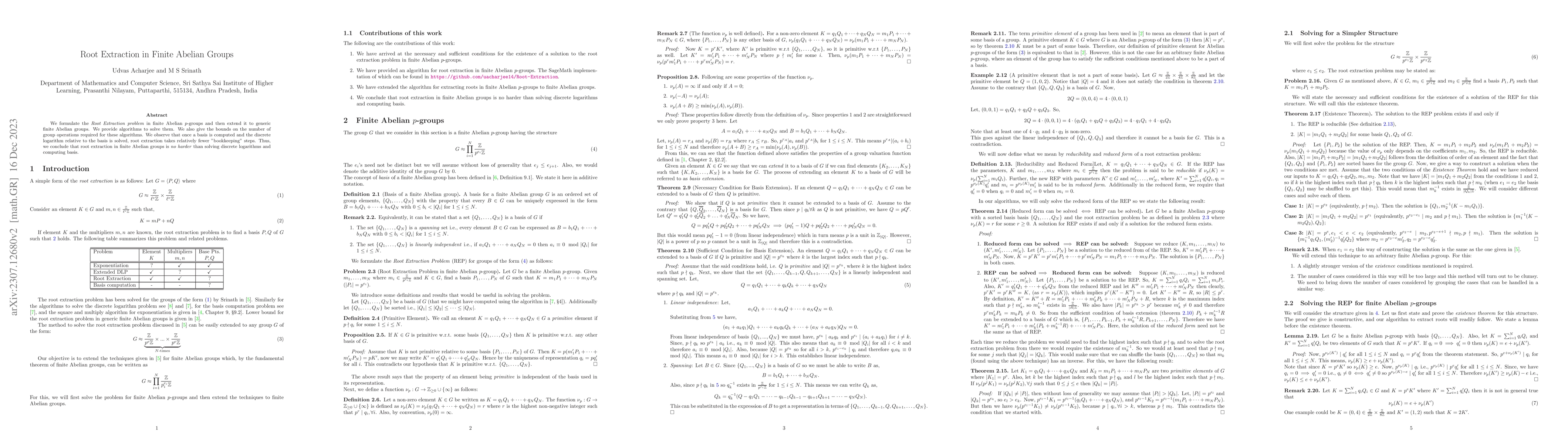 This paper formulates and solves the Root Extraction problem in finite Abelian $p$-groups and extends it to generic finite Abelian groups, providing efficient algorithms and bounds on required group operations. It concludes that root extraction is no harder than solving discrete logarithms and computing a basis.