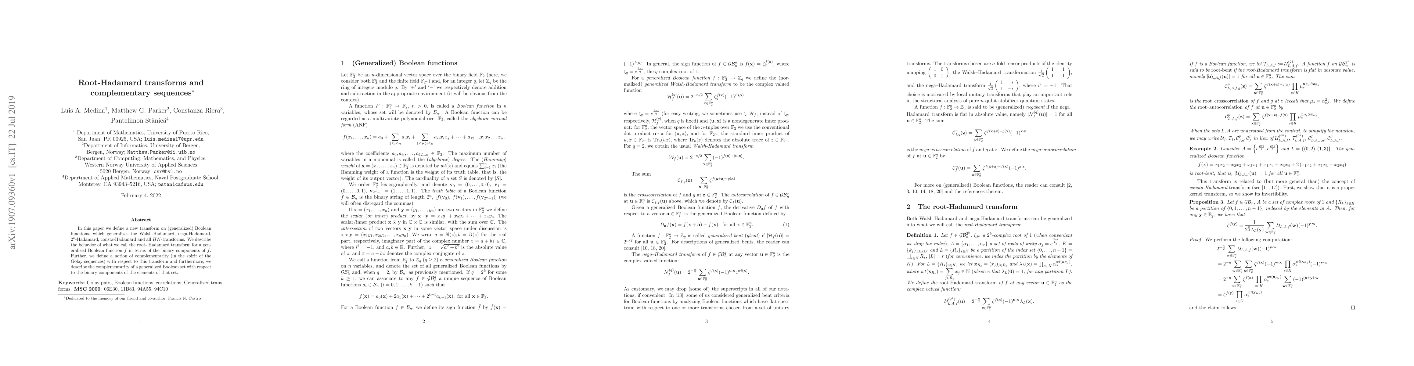 This paper introduces a new transform called the root-Hadamard transform, which generalizes several existing Hadamard transforms. It also defines a concept of complementarity for generalized Boolean functions and sets, inspired by Golay sequences, and explores how this complementarity relates to the binary components of the functions and sets.